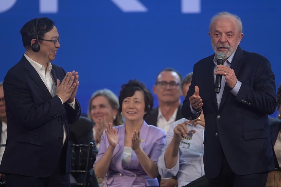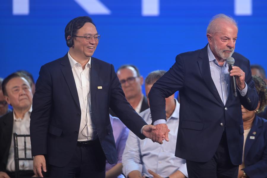 9日、ブラジル北東部のバイーア州カマサリ市で行われた記念式典で、比亜迪(BYD)の王伝福(おう・でんふく)董事長兼総裁(左)と交流するブラジルのルラ大統領(右)。(カマサリ=新華社配信)