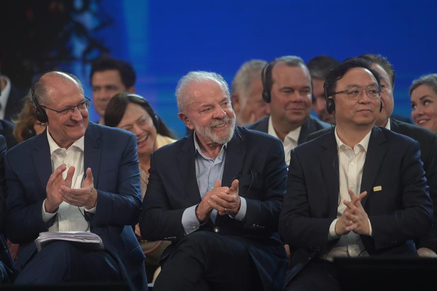 9日、ブラジル北東部のバイーア州カマサリ市で行われた記念式典に出席したブラジルのルラ大統領(中央)。(カマサリ=新華社配信)