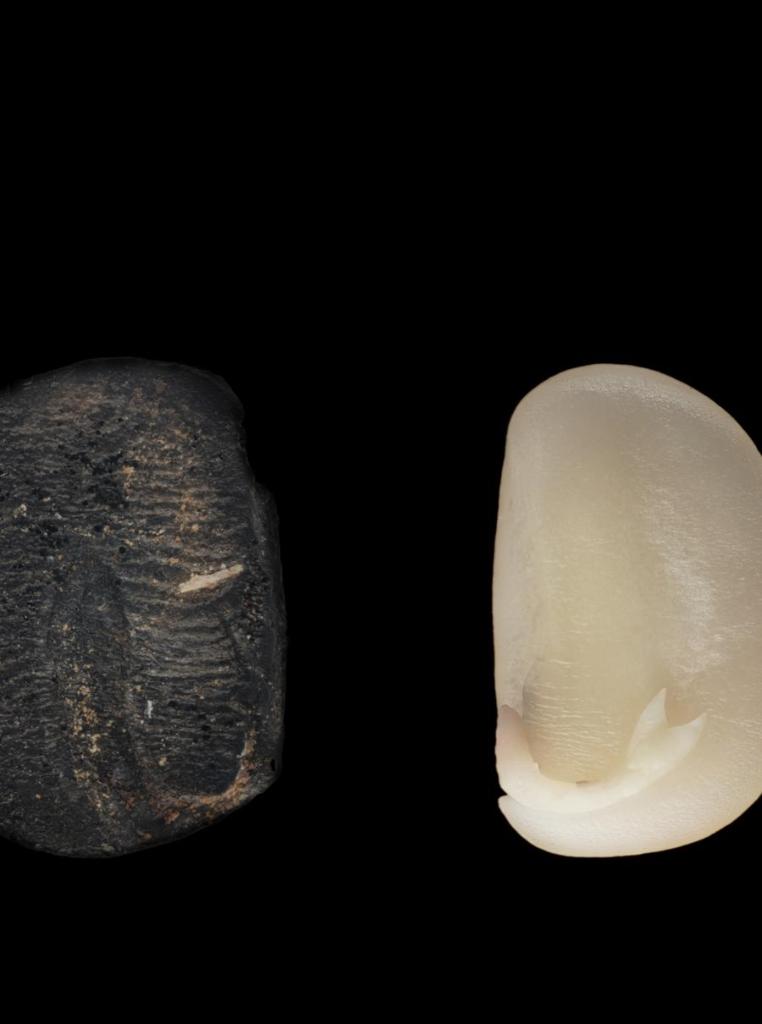 発見された炭化アズキと現在のアズキ。(済南=新華社配信)