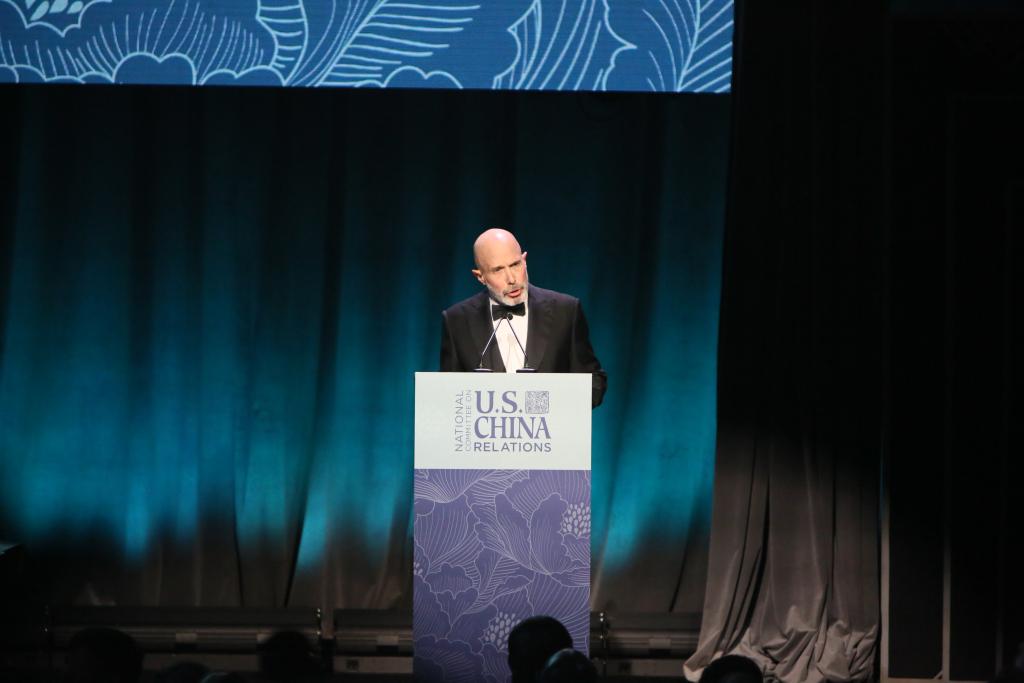 14日、米中関係全国委員会の年次表彰晩餐会であいさつするオーリンズ会長。(ニューヨーク=新華社記者/張鳳国)