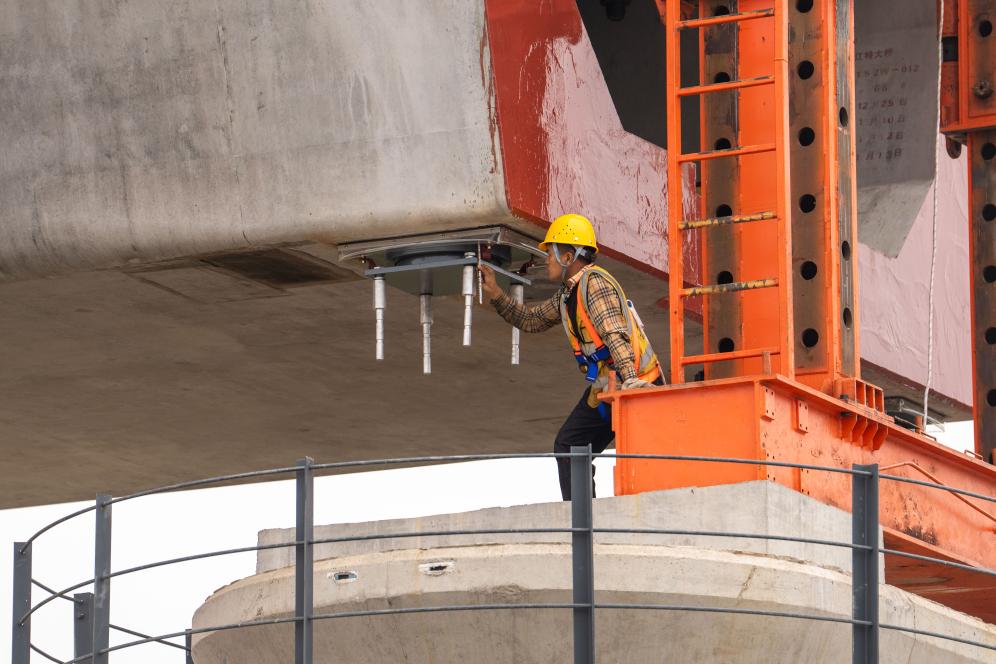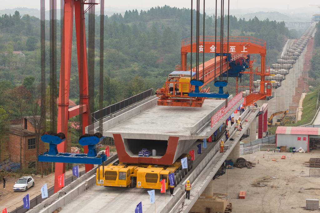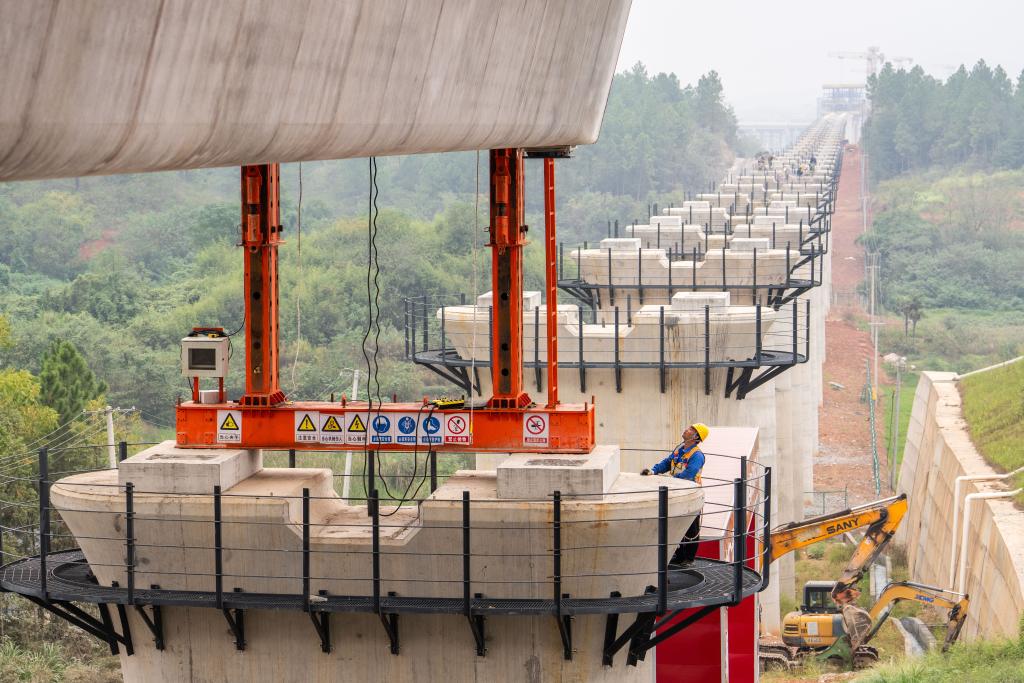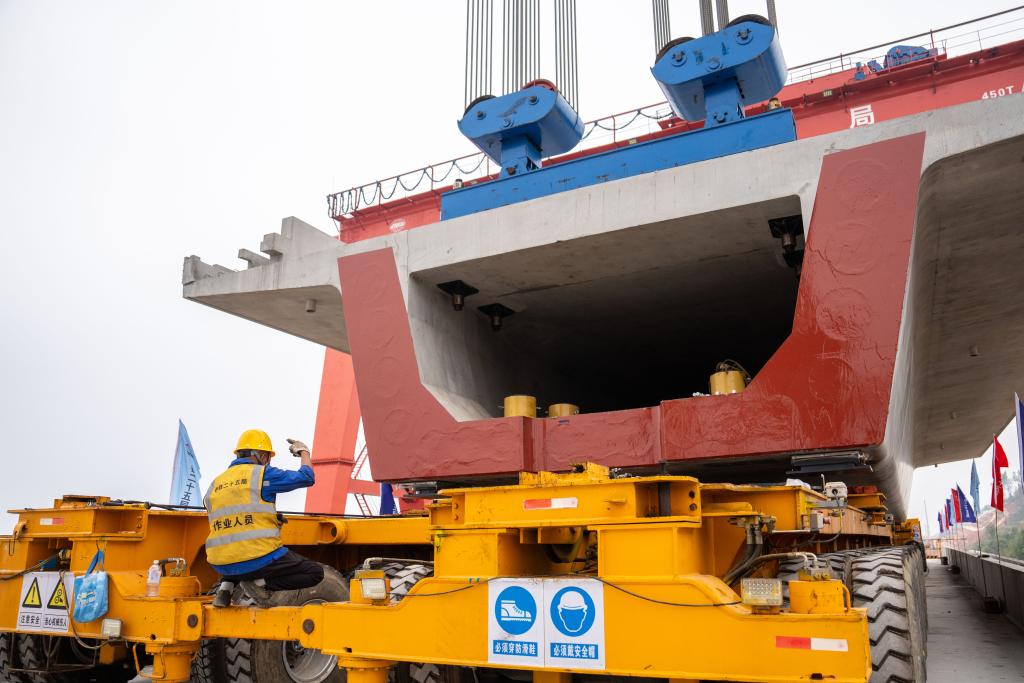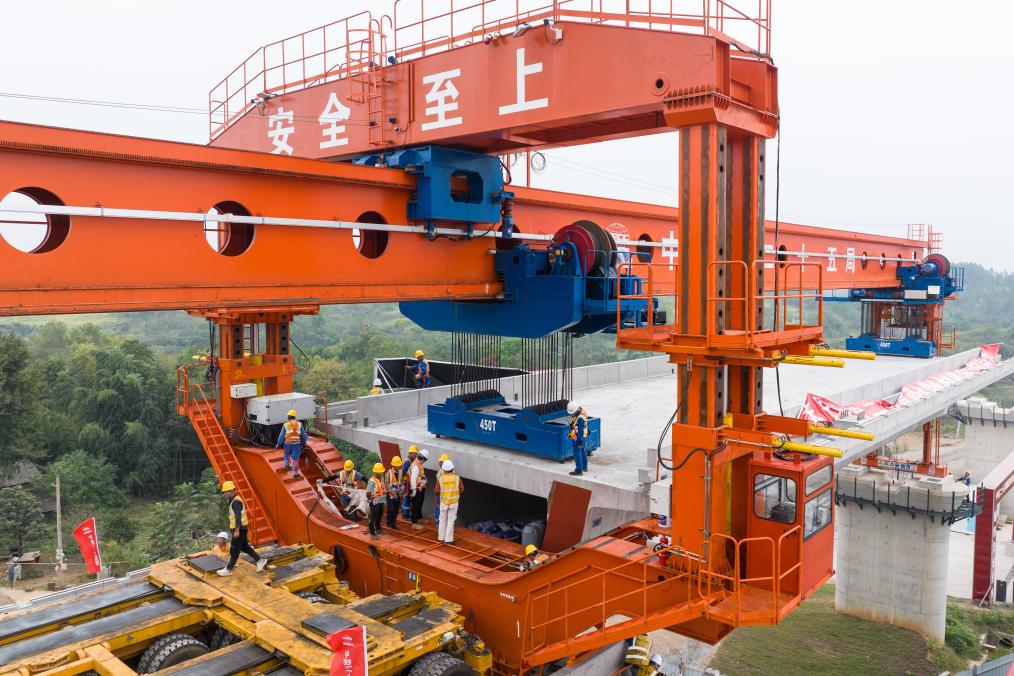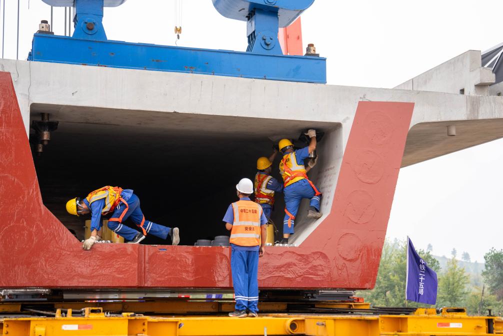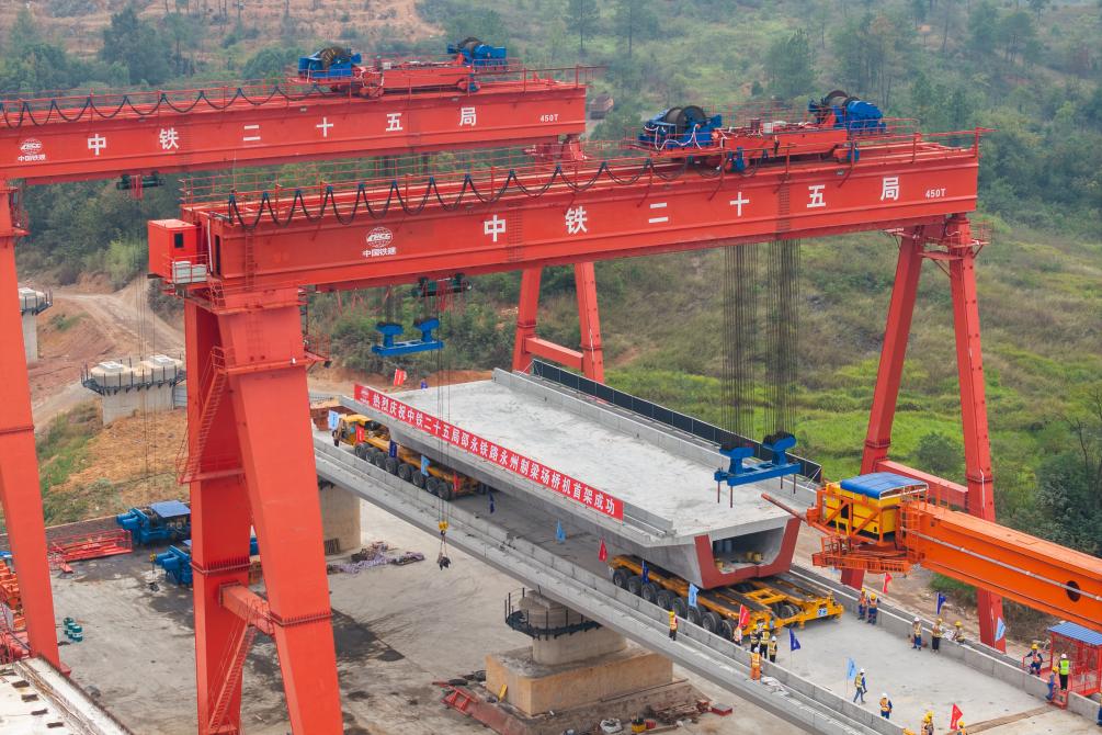 【新華社永州10月16日】中国交通インフラ建設大手、中国鉄建傘下の中鉄二十五局集団が湖南省永州市で建設を担う邵永高速鉄道(湖南省邵陽市-永州市)の芦洪江特大橋に13日、長さ32・6メートル、重さ約817トンの箱桁が設置された。第3工区の橋梁架設は順調に進んでいる。