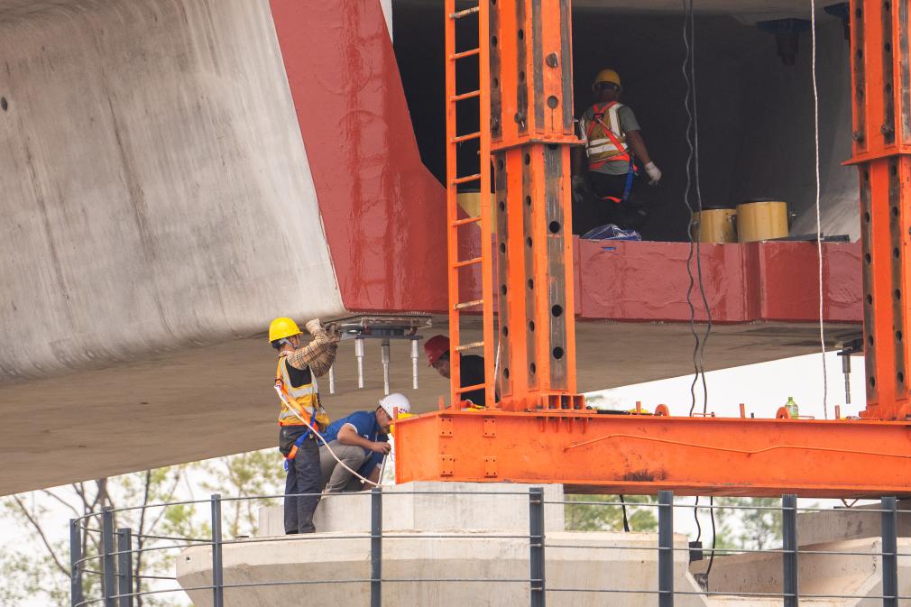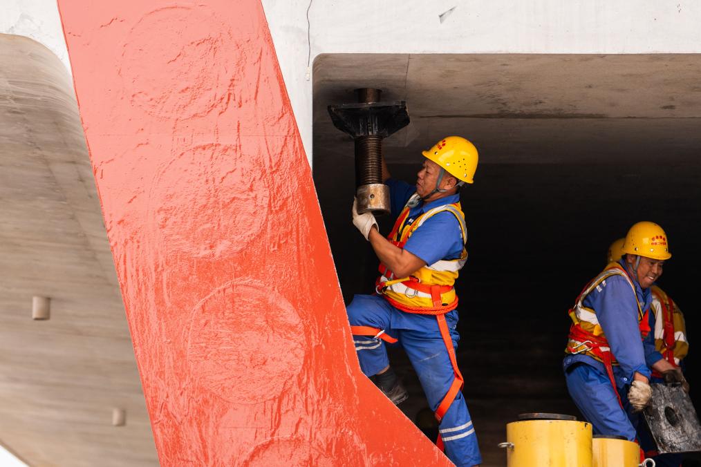 13日、芦洪江特大橋の工事を進める作業員。(永州=新華社記者/陳思汗)