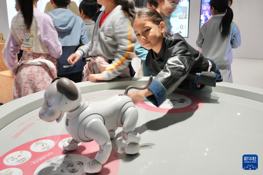 15日、ペットロボットaibo(アイボ)に触れる女の子。(北京=新華社記者/許芸潁)