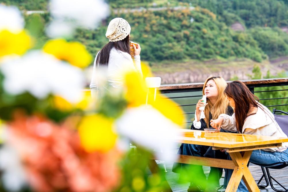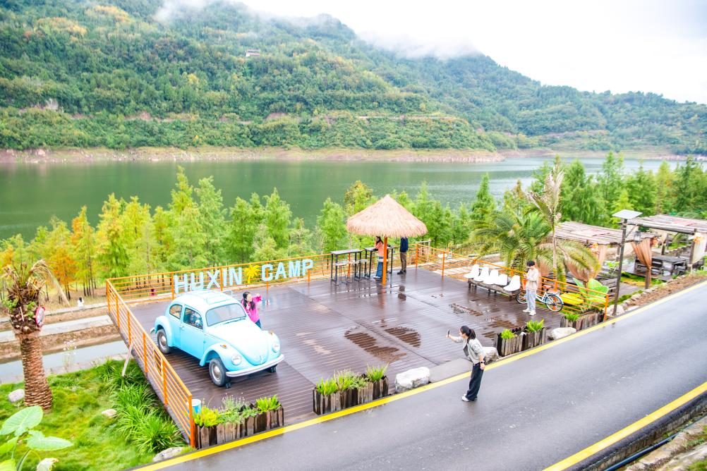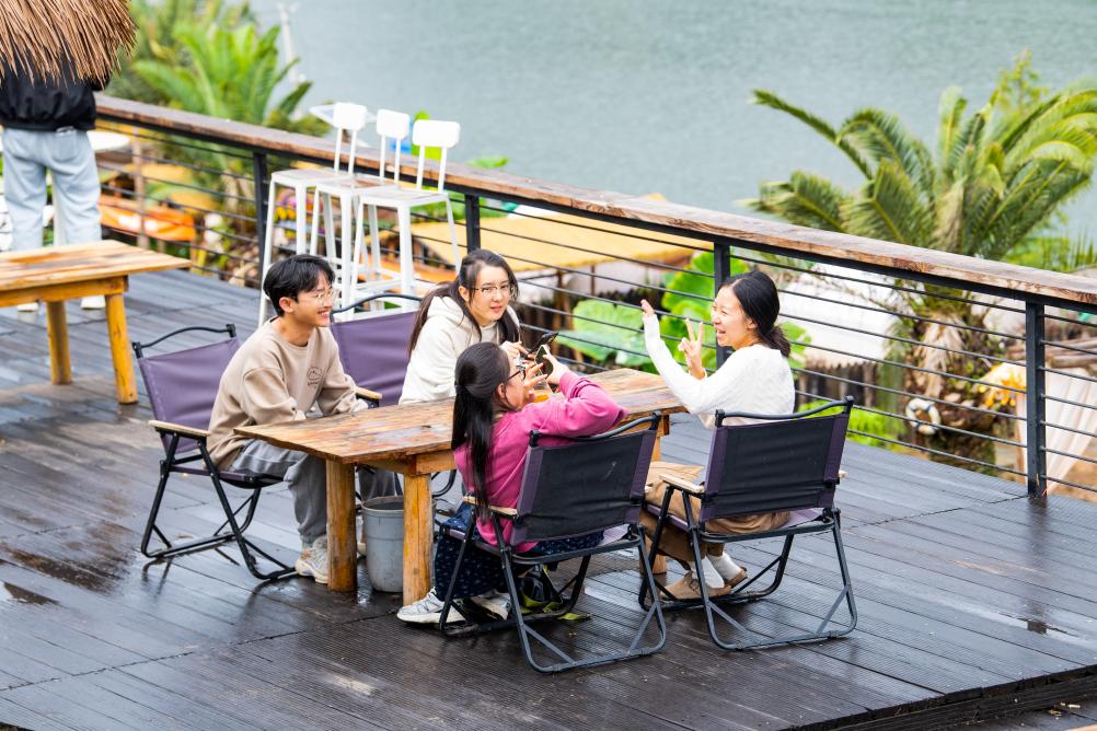 15日、藤子溝国家湿地公園の湖畔でくつろぐ観光客。(重慶=新華社記者/唐奕)