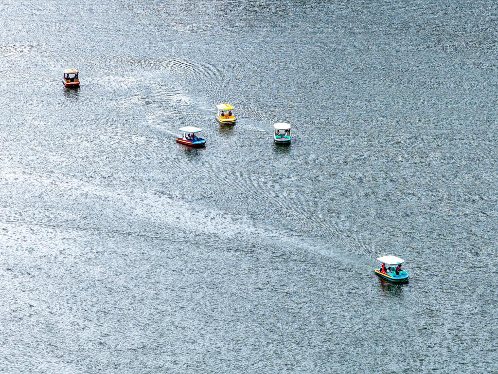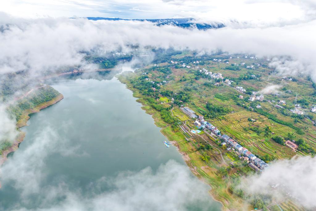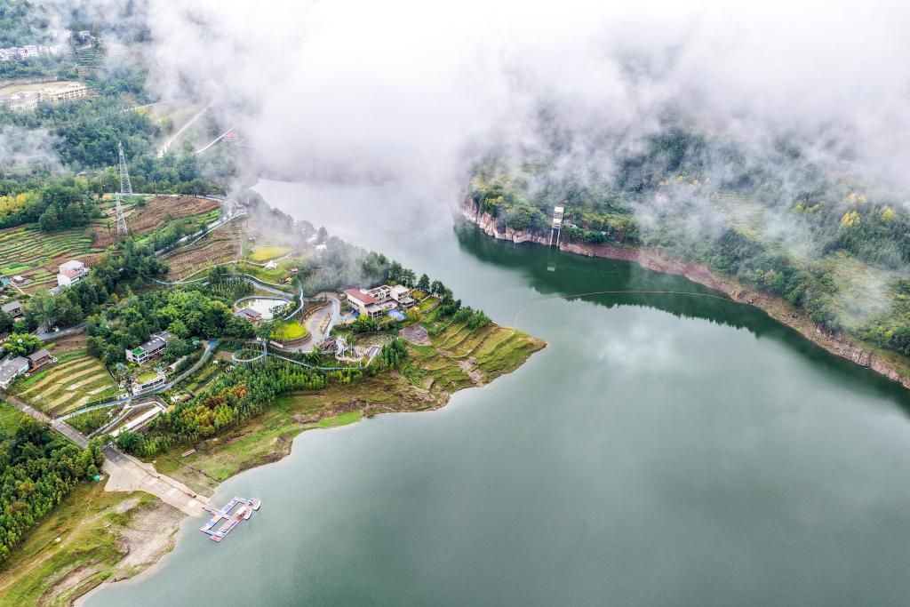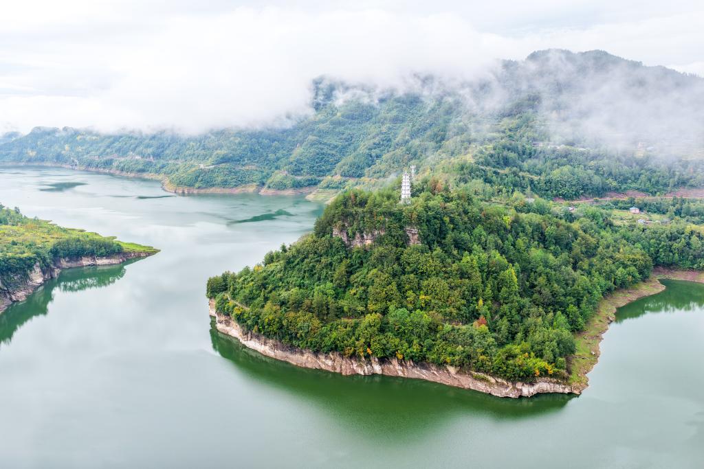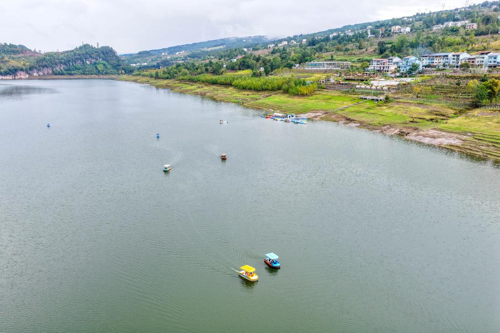 15日、観光客を乗せ、藤子溝国家湿地公園の湖を進むボート。(ドローンから、重慶=新華社記者/唐奕)