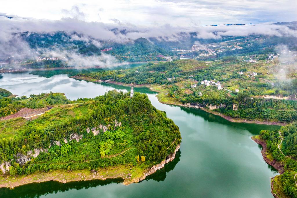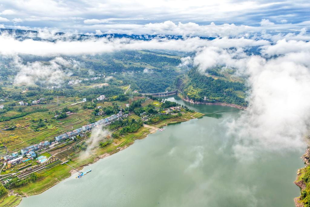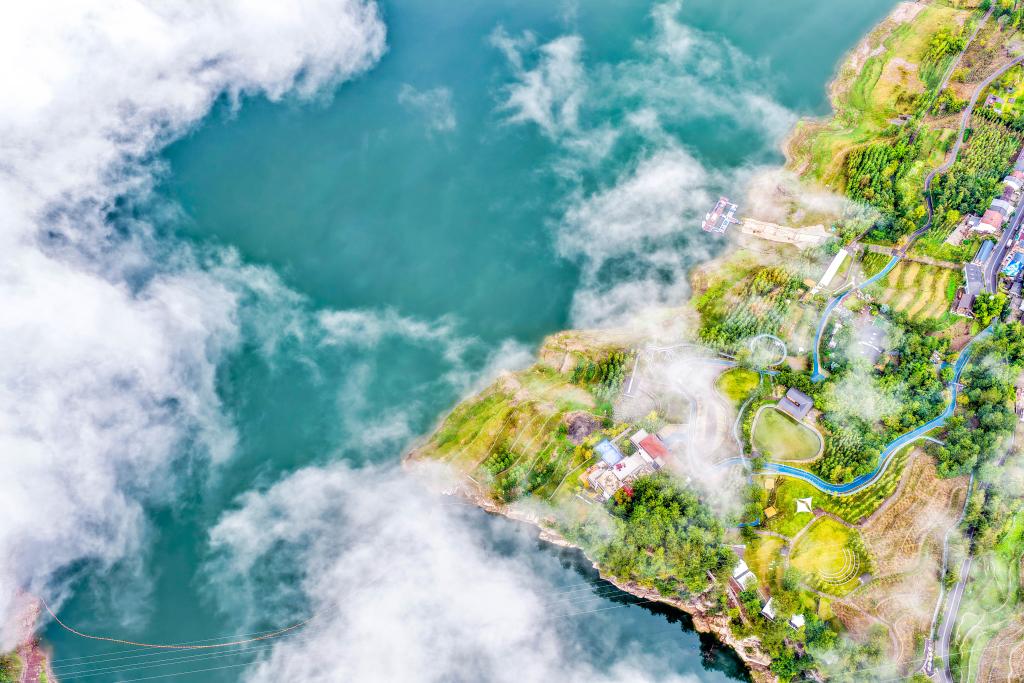 15日、重慶市石柱トゥチャ族自治県橋頭鎮に広がる風景。(ドローンから、重慶=新華社記者/唐奕)