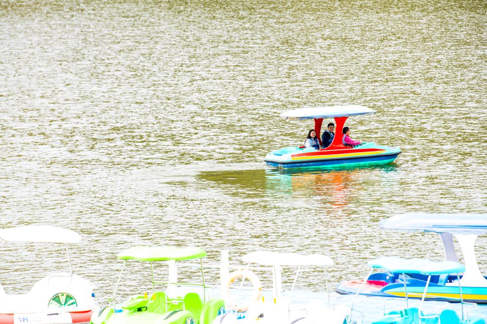 15日、観光客を乗せ、藤子溝国家湿地公園の湖を進むボート。(重慶=新華社記者/唐奕)