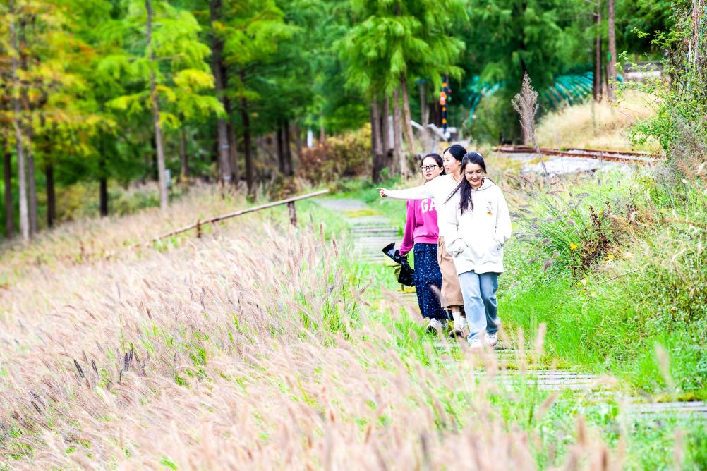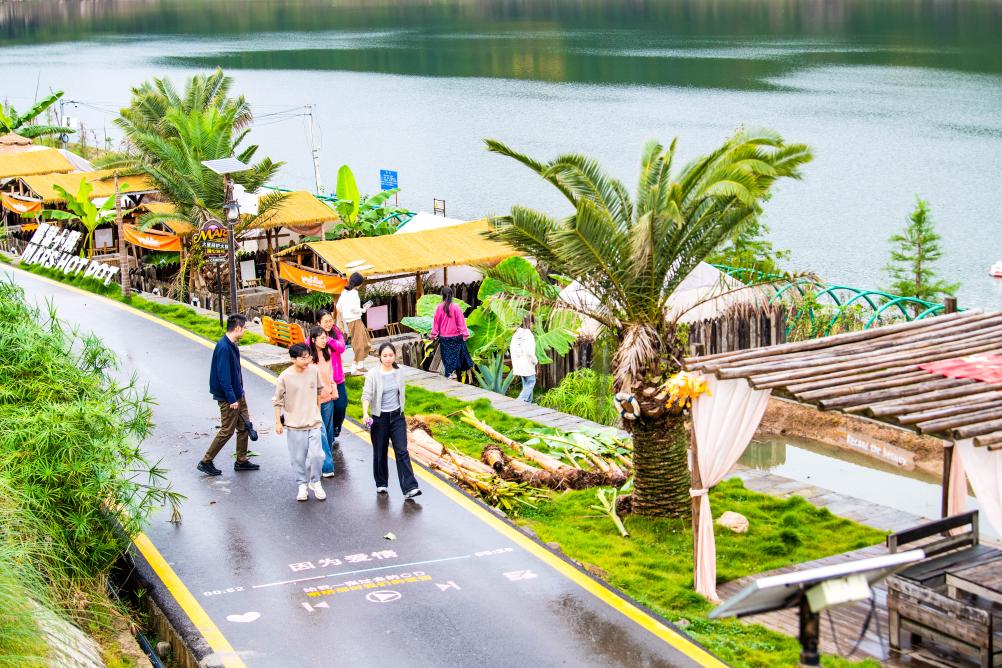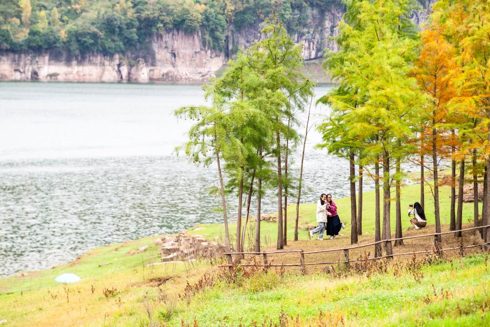 15日、藤子溝国家湿地公園の湖畔を散策する観光客。(重慶=新華社記者/唐奕)