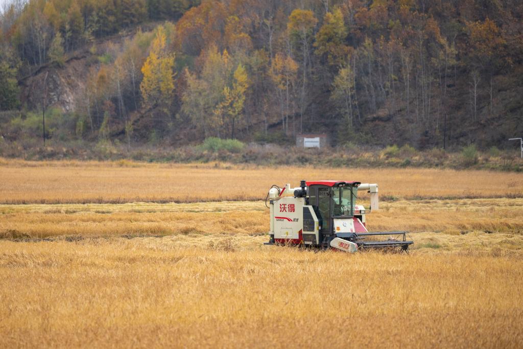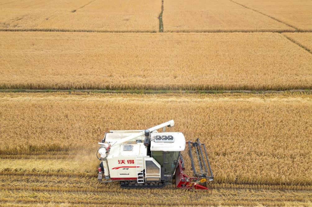 14日、黒竜江省海林市福興村で、稲を収穫するコンバイン。(ハルビン=新華社記者/張濤)