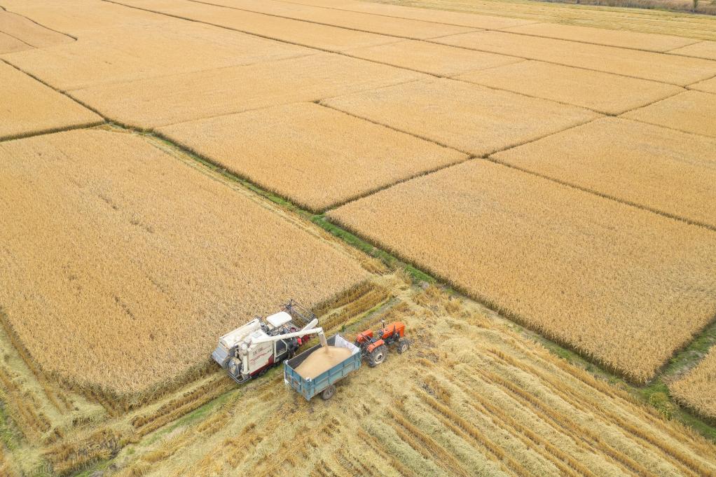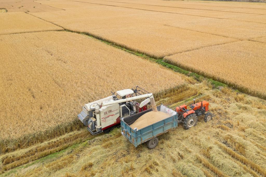 14日、黒竜江省海林市福興村で、コンバインから運搬車に移し替えられる稲。(ドローンから、ハルビン=新華社記者/張濤)