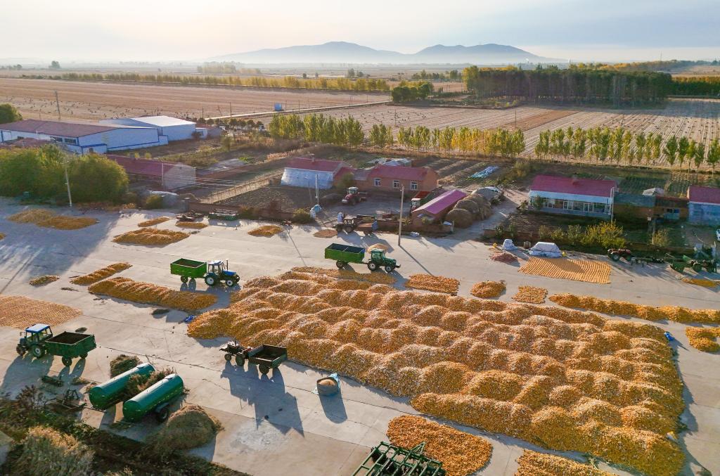 7日、黒竜江省富錦市大楡樹鎮で、収穫した穀物を天日干しする農家の人たち。(ドローンから、ハルビン=新華社配信/庚喜慶)