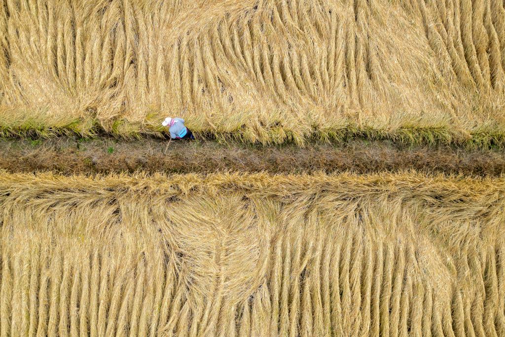 14日、黒竜江省海林市福興村で、稲を収穫するコンバイン。(ドローンから、ハルビン=新華社記者/張濤)