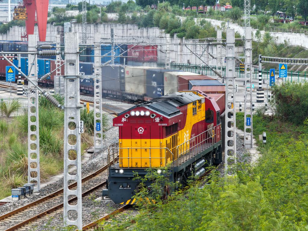 重慶市の魚嘴駅を出発した「西部陸海新ルート」の定期貨物列車。(9月28日、ドローンから、重慶=新華社記者/唐奕)