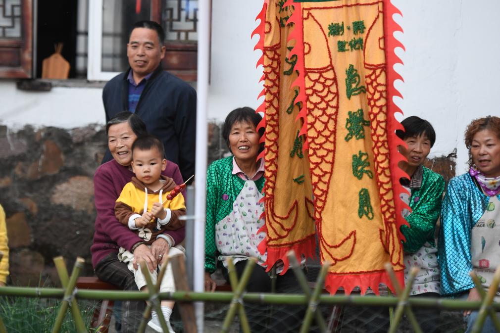 浙江省湖州市の荻港村で、舟に魚や農作物を乗せた「水上の天日干し」の様子を見学し、祭りを楽しむ人々。(資料写真、湖州=新華社記者/黄宗治)