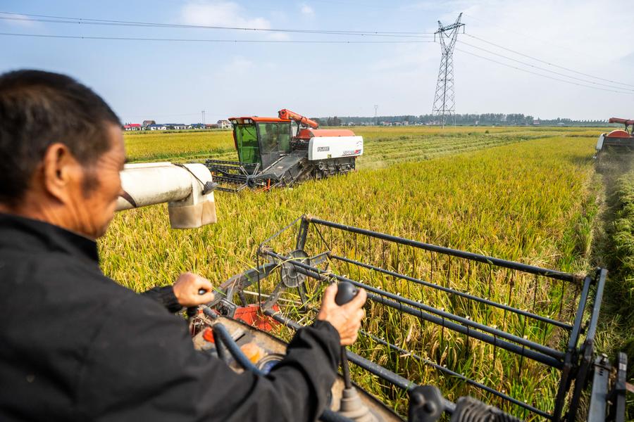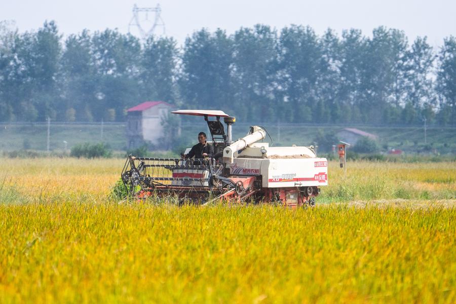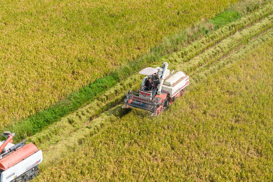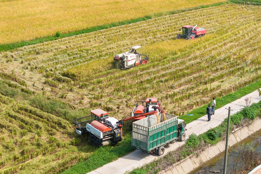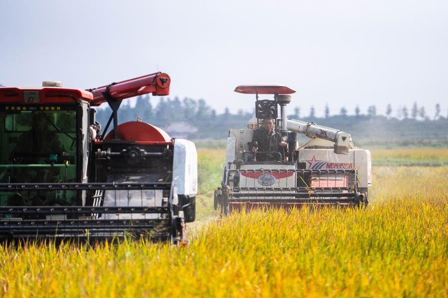 【新華社長沙10月18日】中国湖南省益陽市南県でこのほど、作付面積60万ムー余り(4万ヘクタール)の中稲(なかて)と晩稲(おくて)が刈り取りの時期を迎え、農家の人々が天候を見計らいながら、収穫作業に励んでいる。