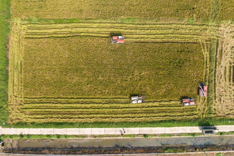 15日、南県南洲鎮育才村で稲を刈り取る農家の人。(ドローンから、長沙=新華社記者/陳思汗)