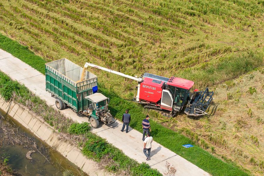 15日、南県南洲鎮育才村で収穫した稲をコンバインから穀物輸送車に積み替える農家の人。(ドローンから、長沙=新華社記者/陳思汗)