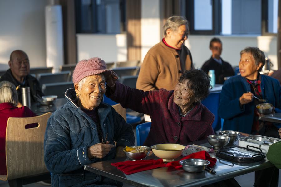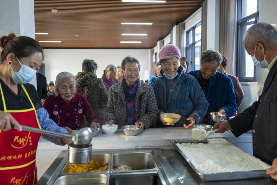 14日、孝昌県王店鎮新崗村の「幸福食堂」で食事をする高齢者ら。(孝昌=新華社記者/伍志尊)