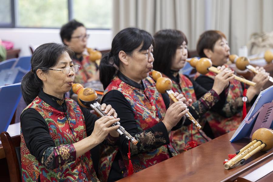 15日、孝昌県の高齢者大学で葫蘆絲(フルス=ヒョウタン笛)の演奏を学ぶ受講生。(孝昌=新華社記者/伍志尊)