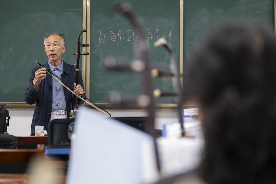 15日、孝昌県の高齢者大学で受講生に二胡を教える講師。(孝昌=新華社記者/伍志尊)