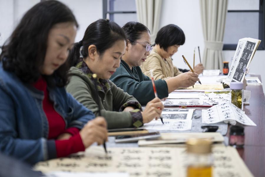15日、孝昌県の高齢者大学で書道を学ぶ受講生。(孝昌=新華社記者/伍志尊)