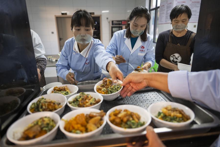 14日、孝昌県王店鎮の松鶴仁高齢者施設で高齢者の夕食を準備する職員。(孝昌=新華社記者/伍志尊)
