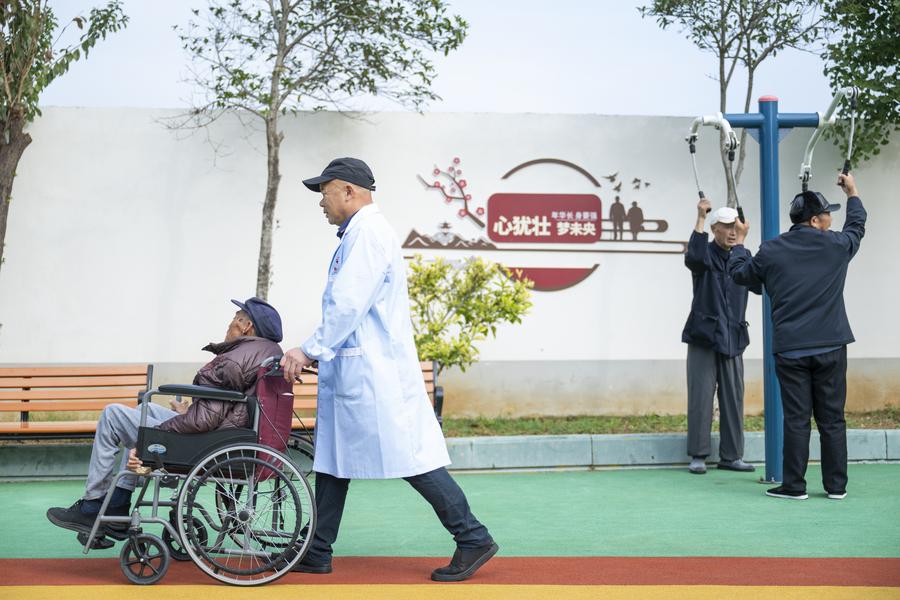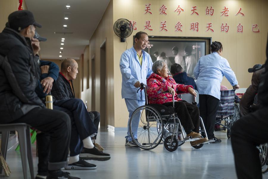 14日、孝昌県王店鎮の松鶴仁高齢者施設で高齢者の世話をする職員。(孝昌=新華社記者/伍志尊)