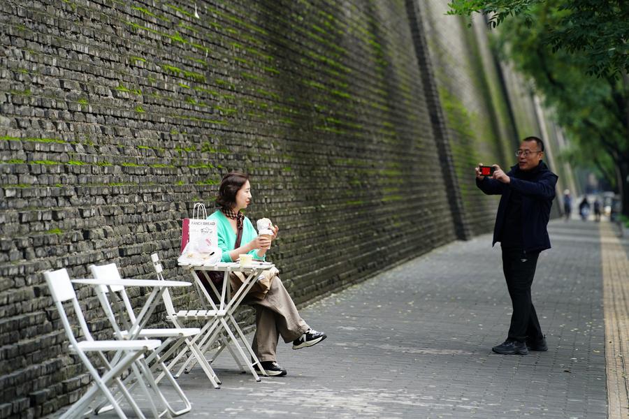 13日、西安城壁北区間で写真を撮る観光客。(西安=新華社記者/邵瑞)