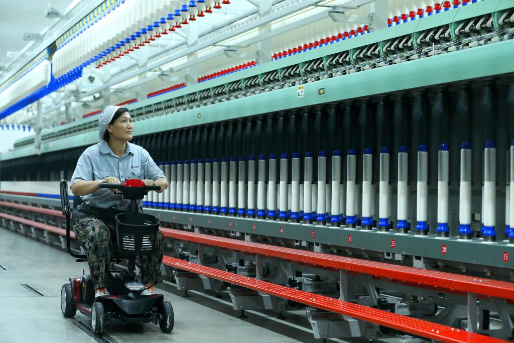 山東省青島市のハイテク繊維企業で、スマート紡績生産ラインを巡回点検する従業員。(7月30日撮影、青島=新華社配信/梁孝鵬)