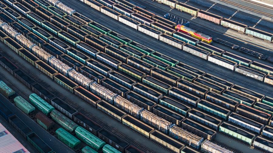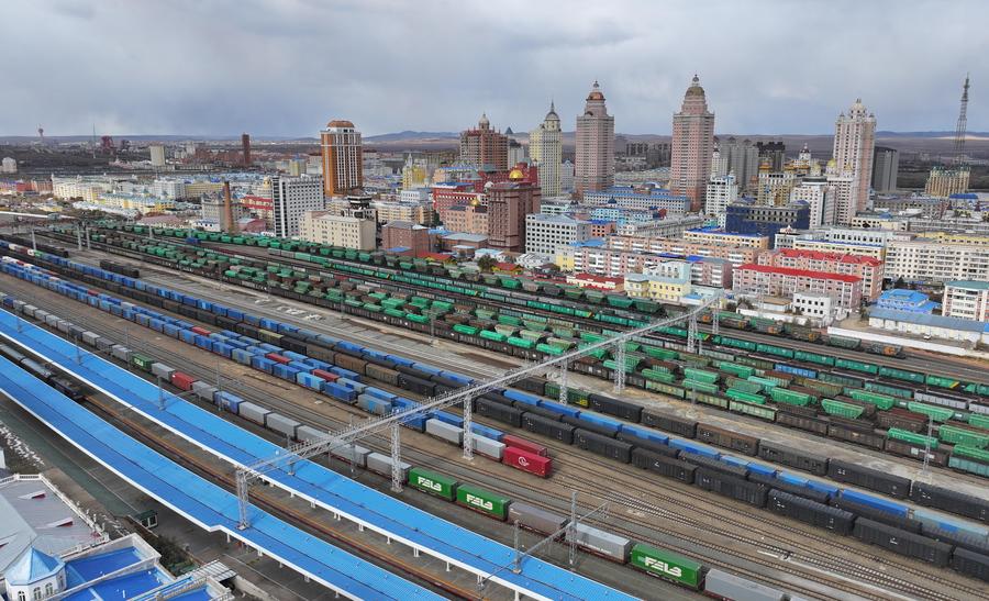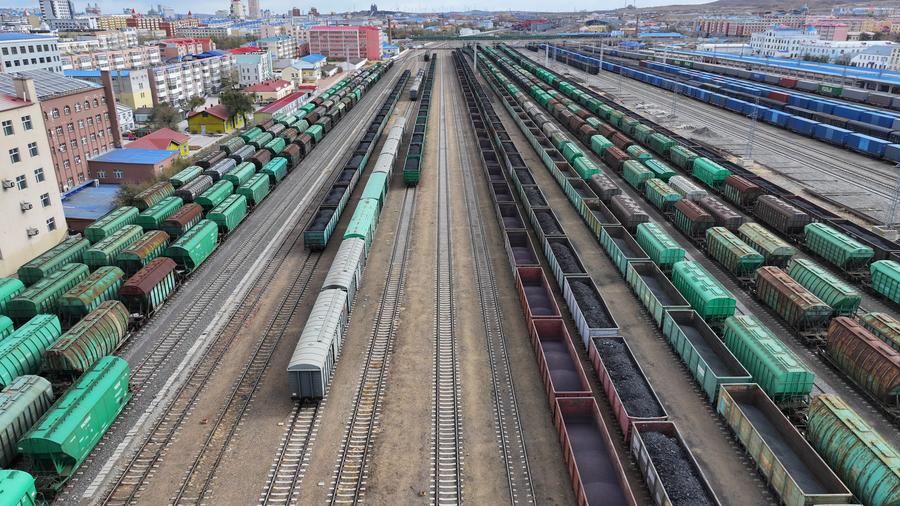 18日、内モンゴル自治区の満洲里駅で撮影した貨物列車。(ドローンから、ハルビン=新華社配信/黄旭)