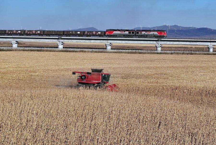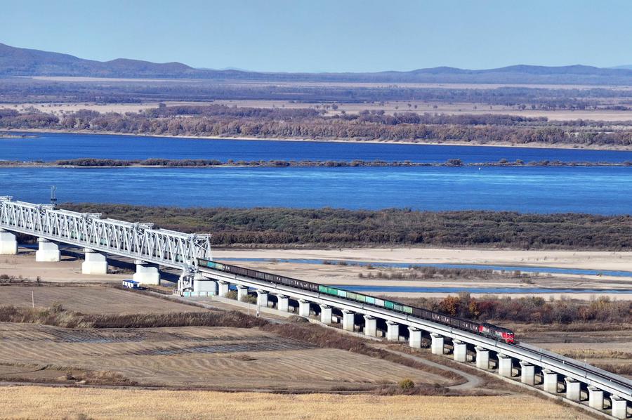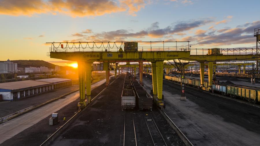 16日、輸入貨物を載せて黒竜江省の同江北駅へ向かう列車。(ドローンから、ハルビン=新華社配信/呉雨南)