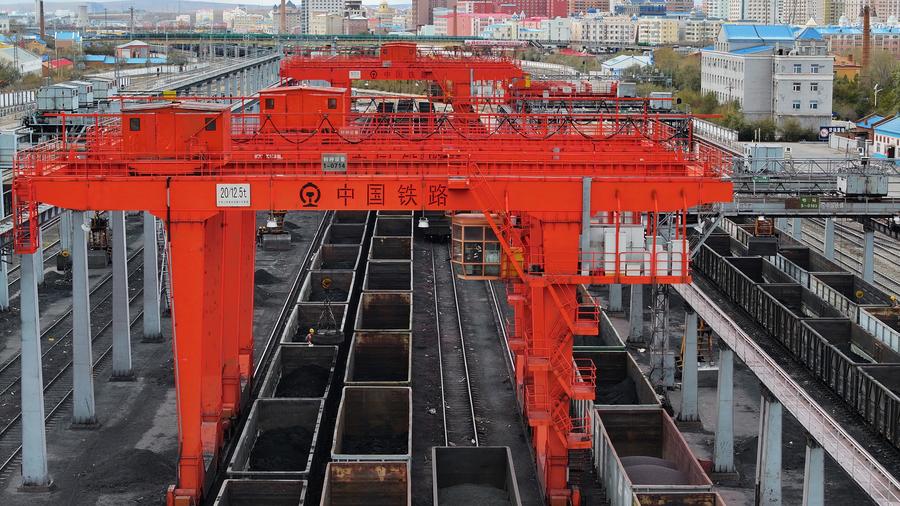 18日、黒竜江省の綏芬河駅南ヤードで車両の解結とコンテナ積み替えを待つ列車。(ドローンから、ハルビン=新華社配信/曲芸偉)