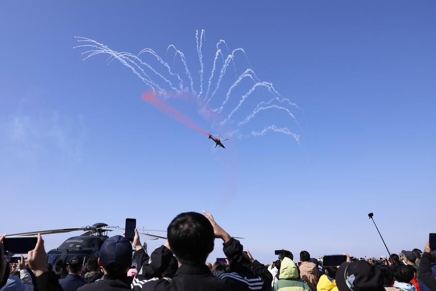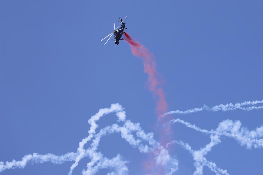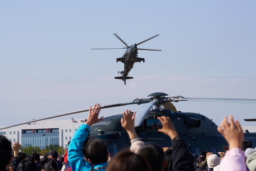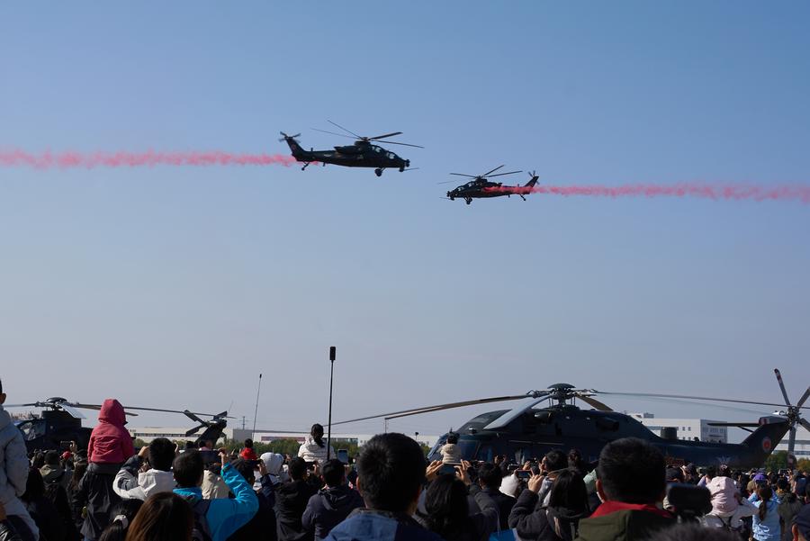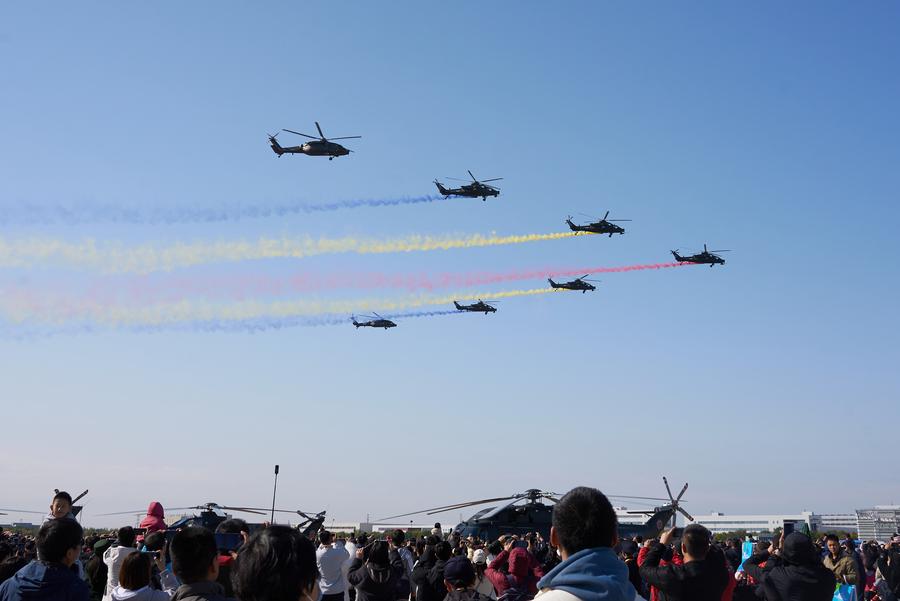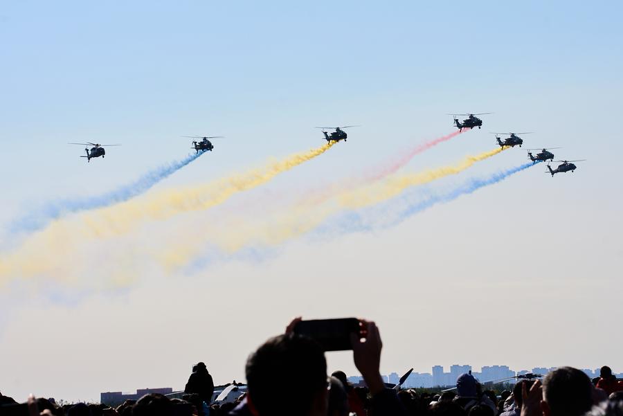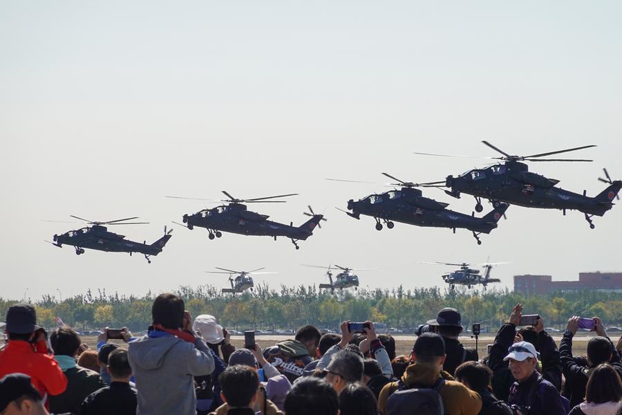 【新華社天津10月19日】中国天津市で開かれている第7回中国天津国際ヘリコプター博覧会は18日、一般公開に入った。中国人民解放軍陸軍「風雷」飛行表演隊がアクロバット飛行を披露し、来場者を魅了した。