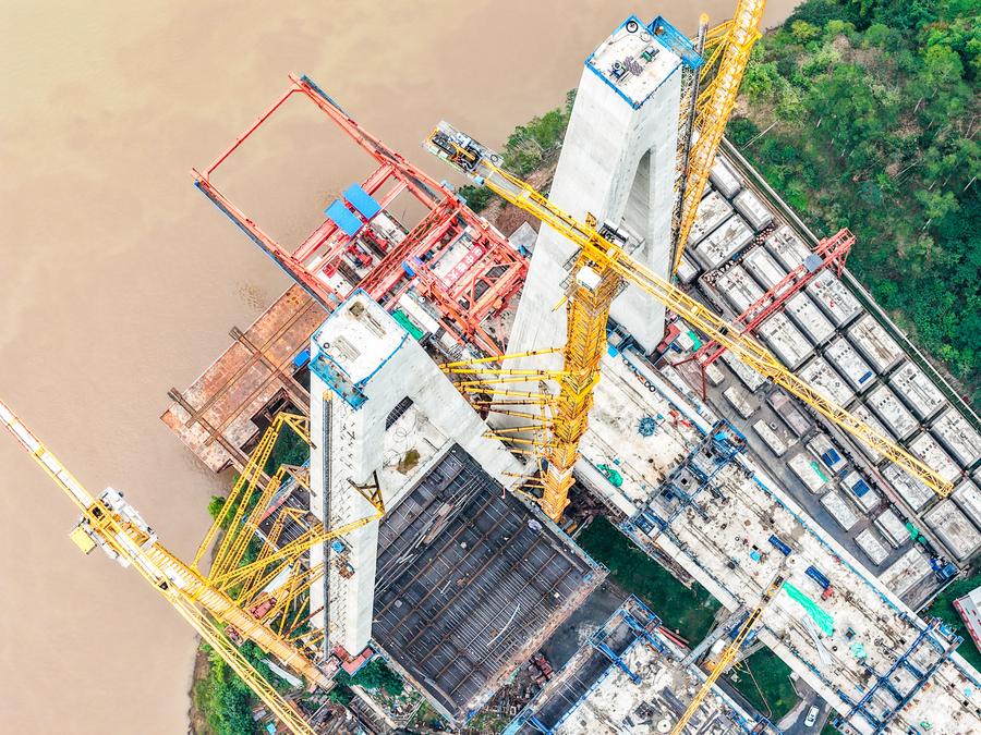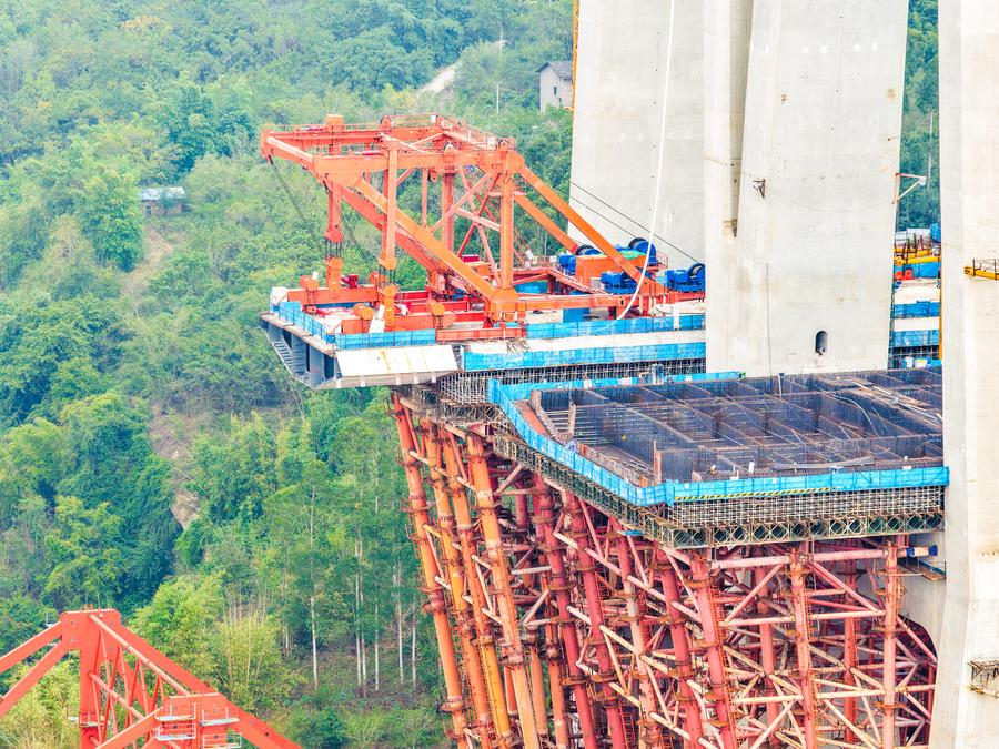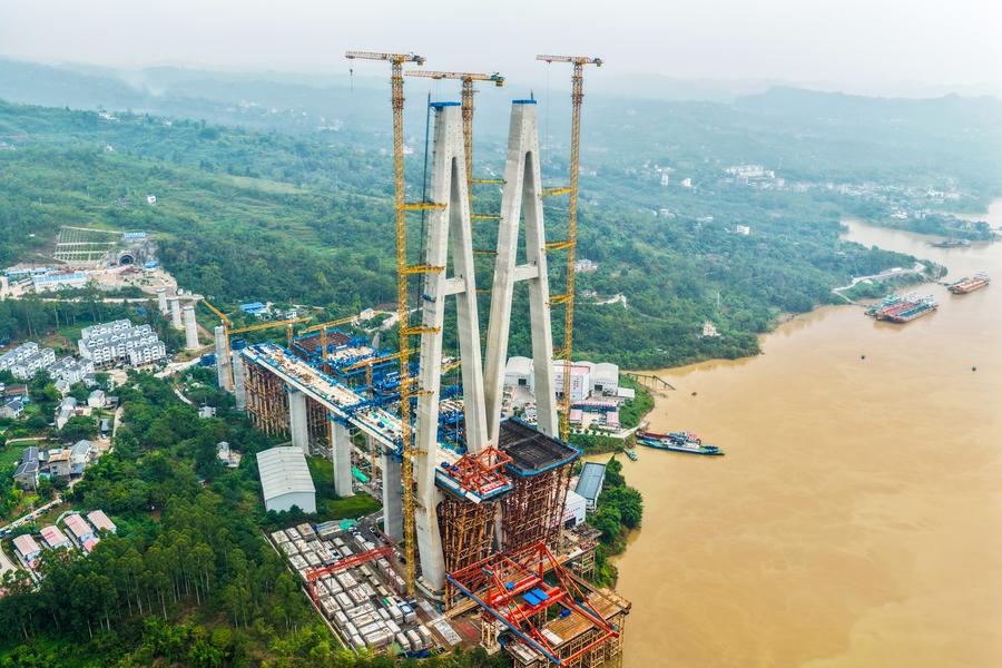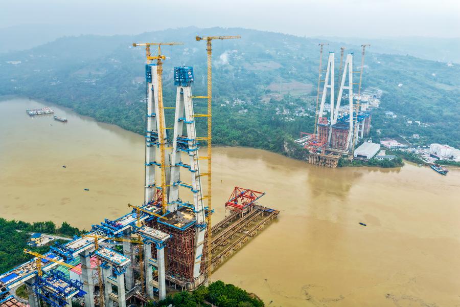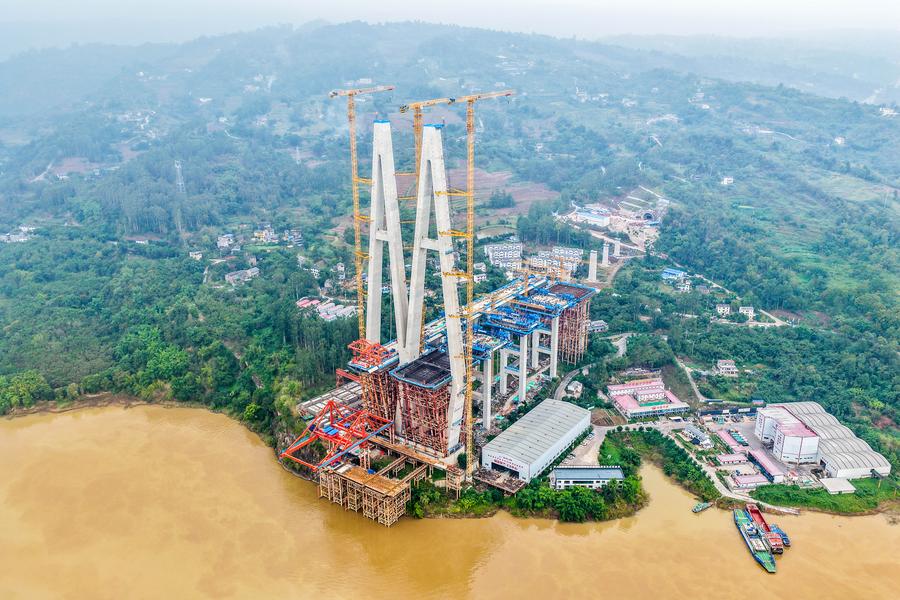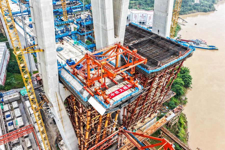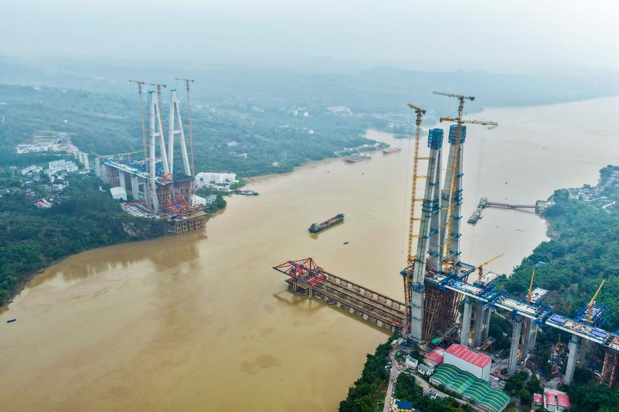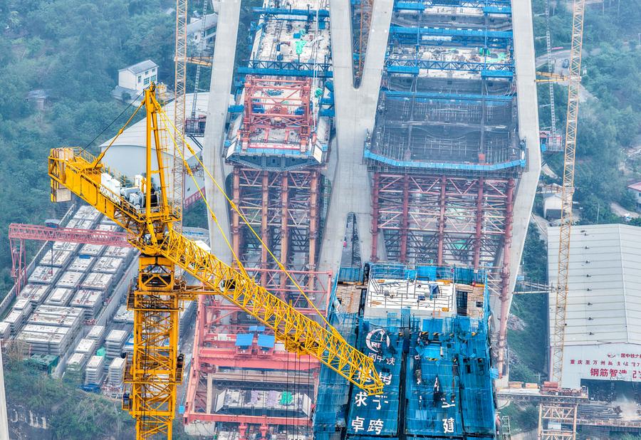 同橋は渝万高速鉄道の主要プロジェクトの一つで、主橋部の全長は1056メートル、主径間は608メートル。今回架設された合成桁は長さ9・625メートル、幅23・6メートル、高さ4・514メートル、重量は約550トンに達する。