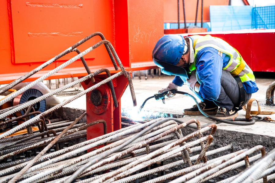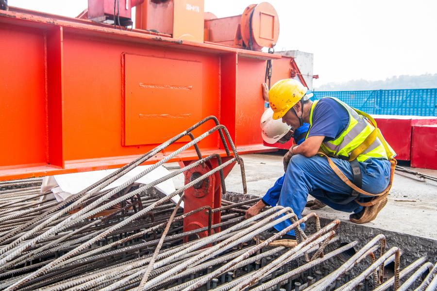 17日、渝万高速鉄道・石沱長江大橋の建設現場で働く作業員。、重慶=新華社記者/唐奕)
