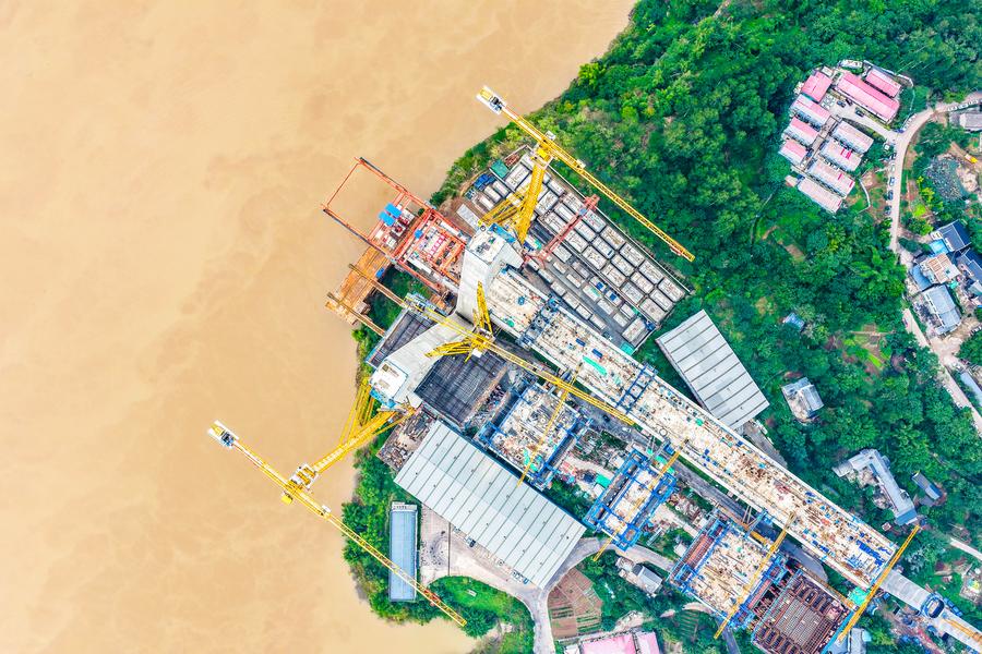 17日、渝万高速鉄道・石沱長江大橋の建設現場。(ドローンから、重慶=新華社記者/唐奕)