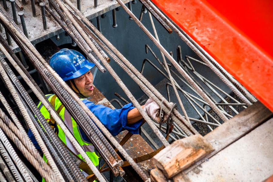 17日、渝万高速鉄道・石沱長江大橋の建設現場で働く作業員。(重慶=新華社記者/唐奕)