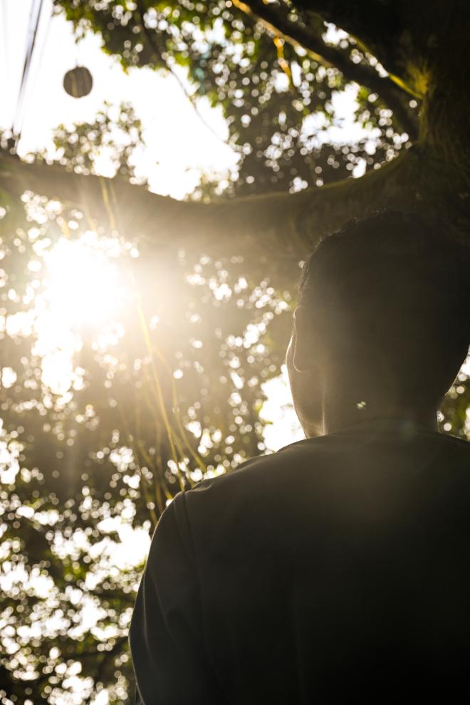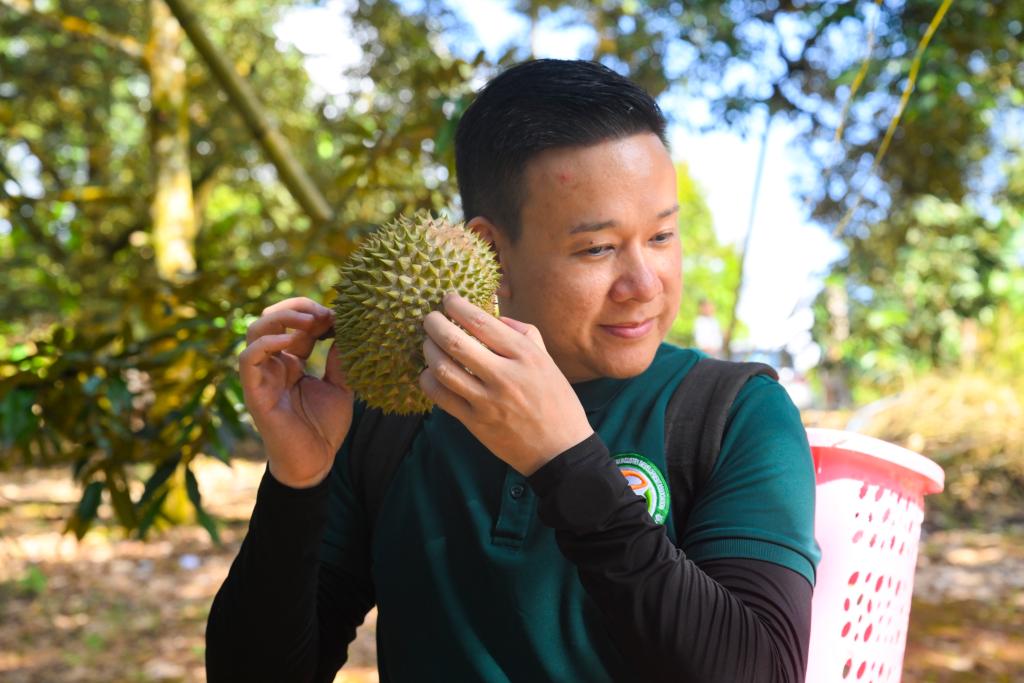 16日、マレーシア・パハン州のラウブにあるドリアン農園でドリアンを耳元で揺らし、果肉の揺れる音で成熟度を確かめる買い付け業者。(クアラルンプール=新華社記者/程一恒)