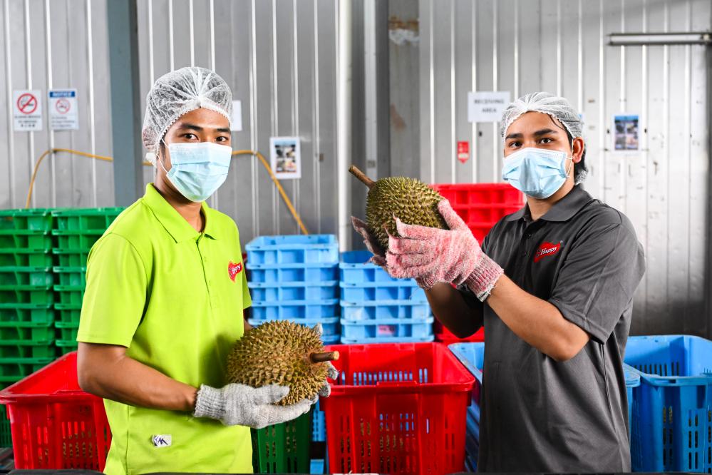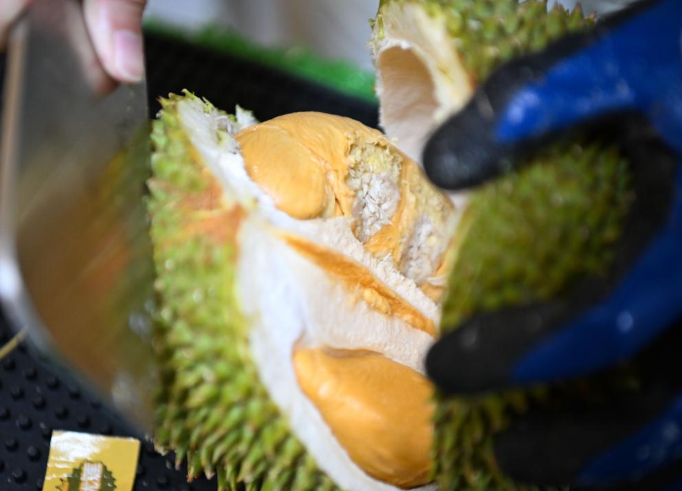 16日、マレーシア・セランゴール州にあるドリアン加工工場でドリアンを見せる従業員。(クアラルンプール=新華社記者/程一恒)