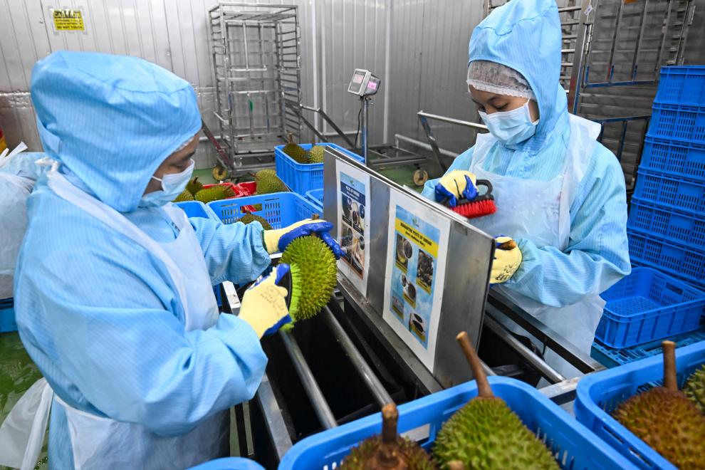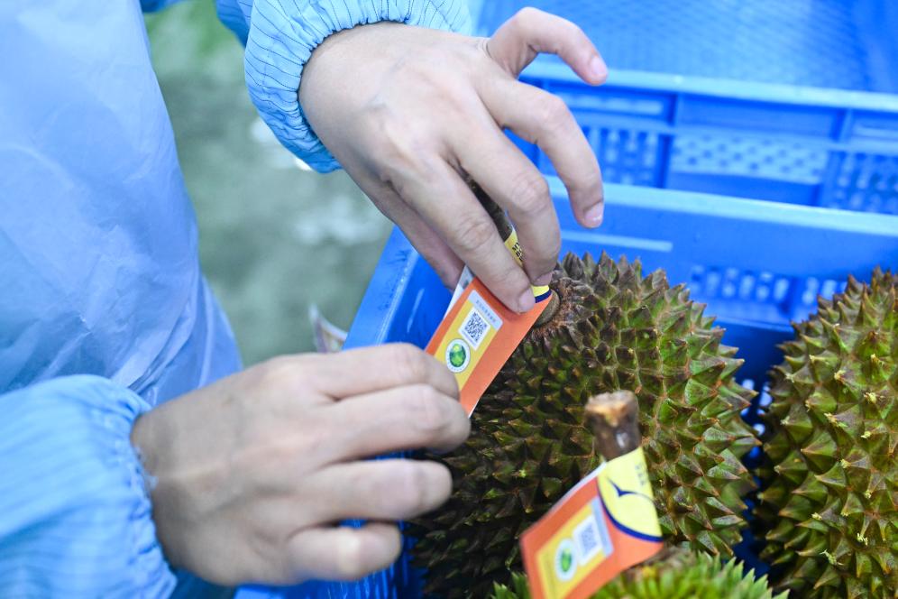 16日、マレーシア・セランゴール州にあるドリアン加工工場で、重量ごとにドリアンを選別し、一つ一つに「トレーサビリティコード」のついたラベルを貼る従業員。(クアラルンプール=新華社記者/程一恒)