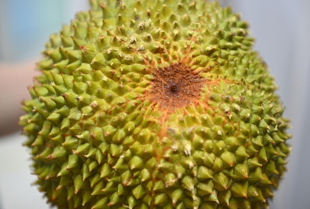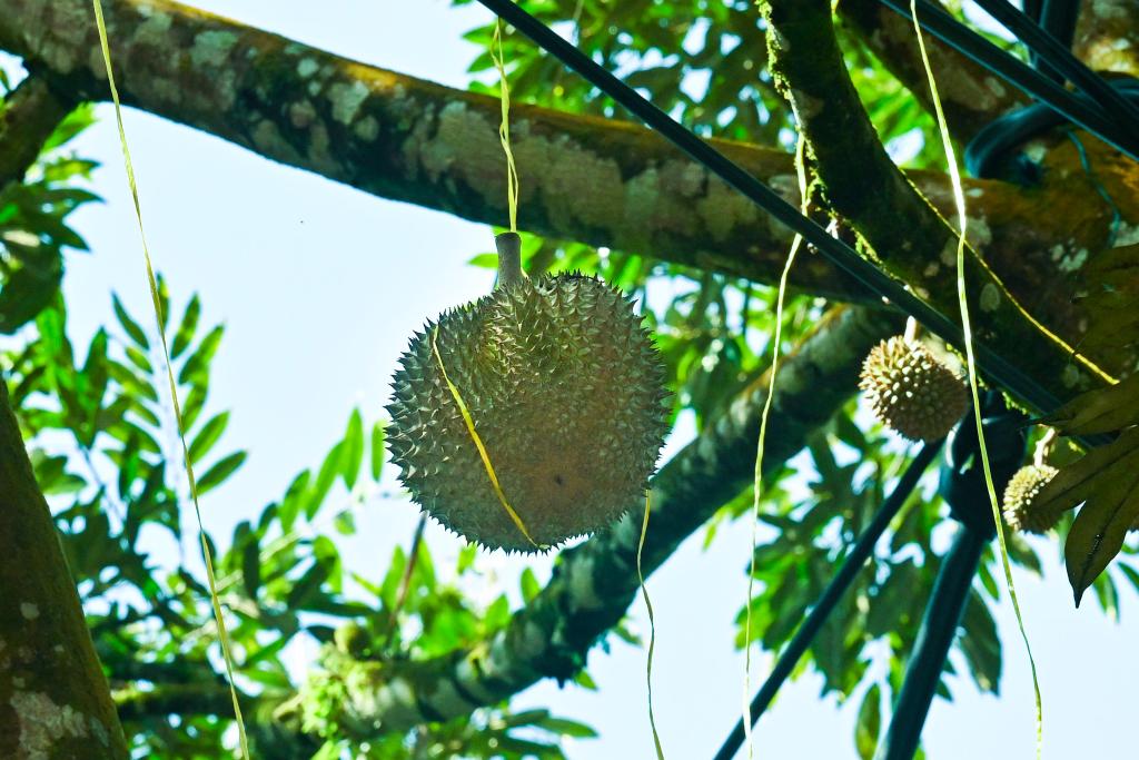 16日、マレーシア・パハン州のラウブに植えられたドリアンの木に実ったブラックソーン。(クアラルンプール=新華社記者/程一恒)