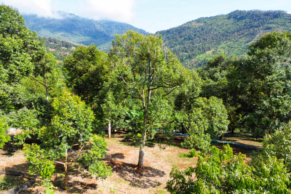 16日、マレーシア・パハン州のラウブにあるドリアン農園。(ドローンから、クアラルンプール=新華社記者/程一恒)