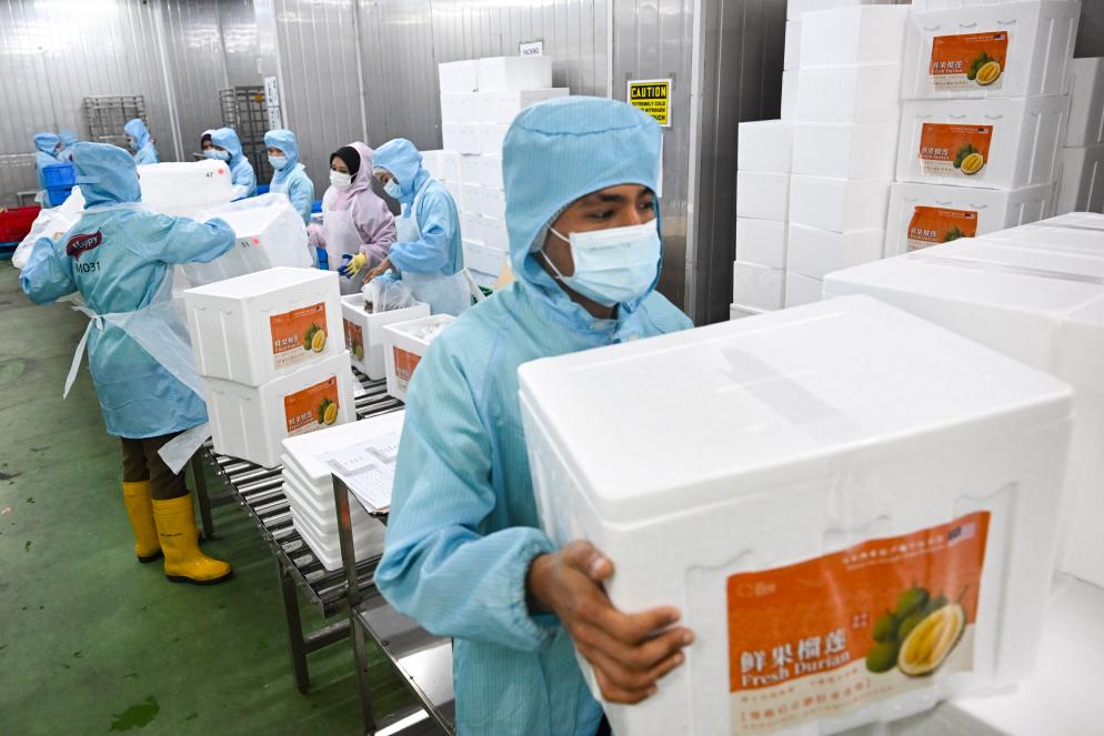 16日、マレーシア・セランゴール州にあるドリアン加工工場で、密封したドリアン入りの箱を定温冷蔵車に積み込む従業員。(クアラルンプール=新華社記者/程一恒)