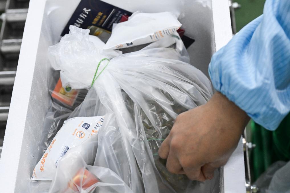 16日、マレーシア・セランゴール州にあるドリアン加工工場で、吸水紙と氷袋の入った発泡スチロール箱に選別済みのドリアンを入れる従業員。(クアラルンプール=新華社記者/程一恒)