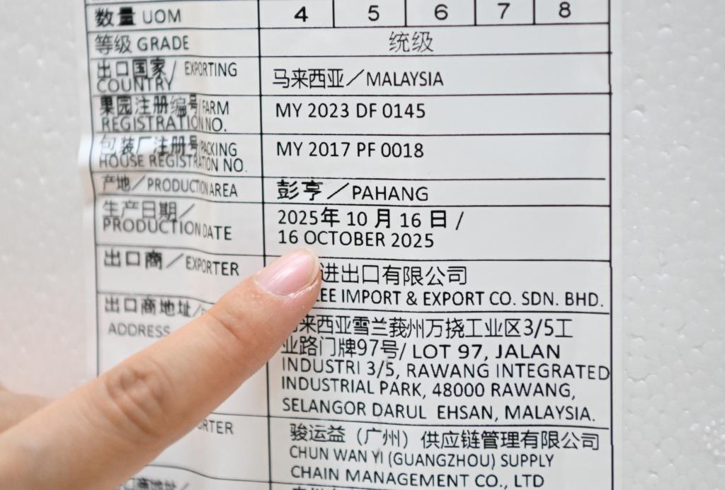 17日、広州市白雲区にある果物販売店の運営センターで、入荷したドリアンに貼られたラベル。(広州=新華社記者/鄧華)