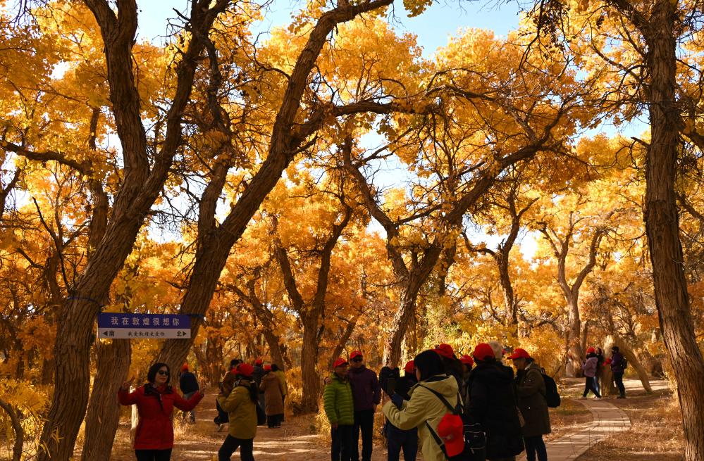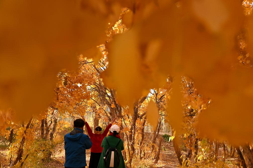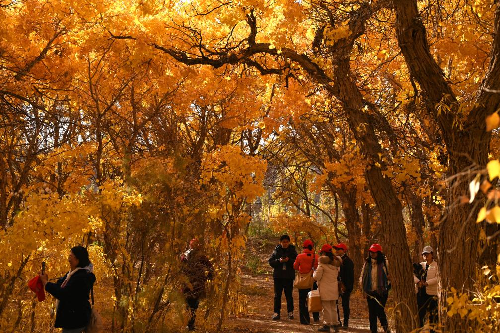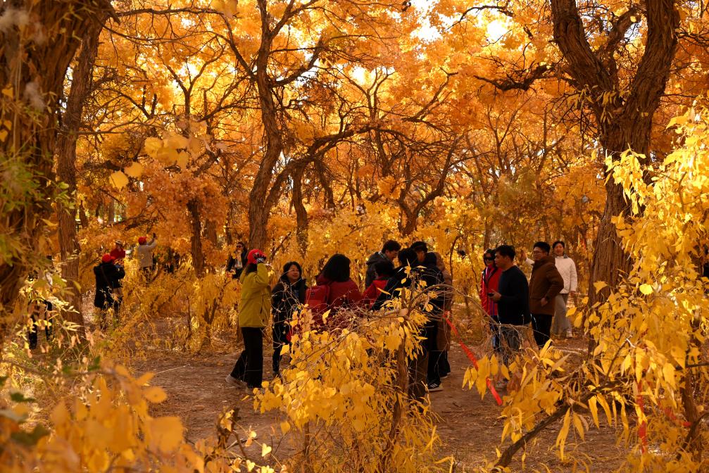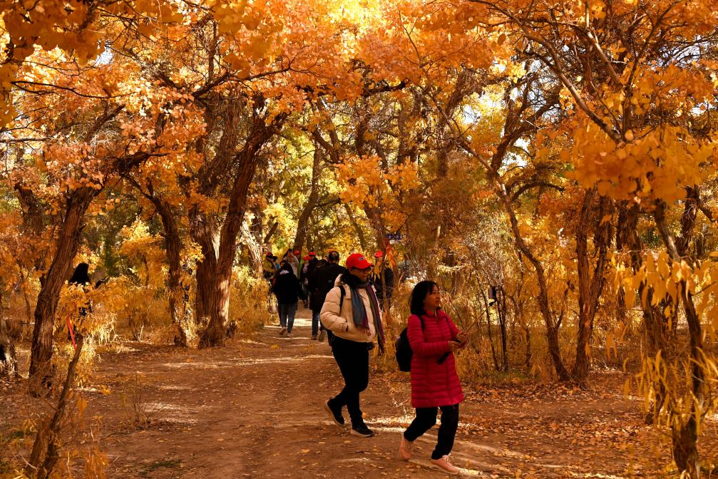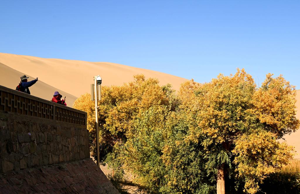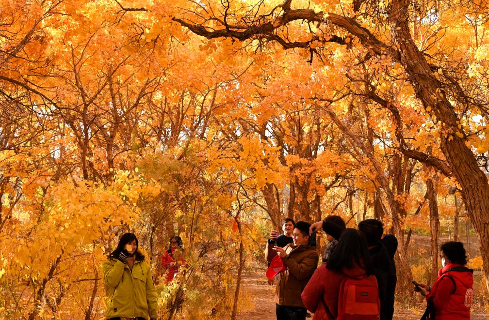 【新華社敦煌10月22日】中国甘粛省敦煌市では、コトカケヤナギ林が黄金色に染まり、秋の絶景を描き出している。見頃を迎えた林には、多くの観光客が訪れ、写真撮影を楽しんでいる。