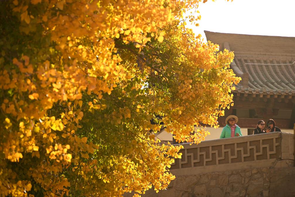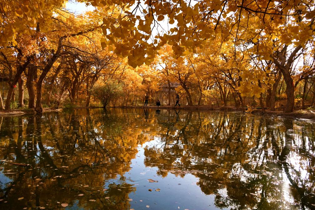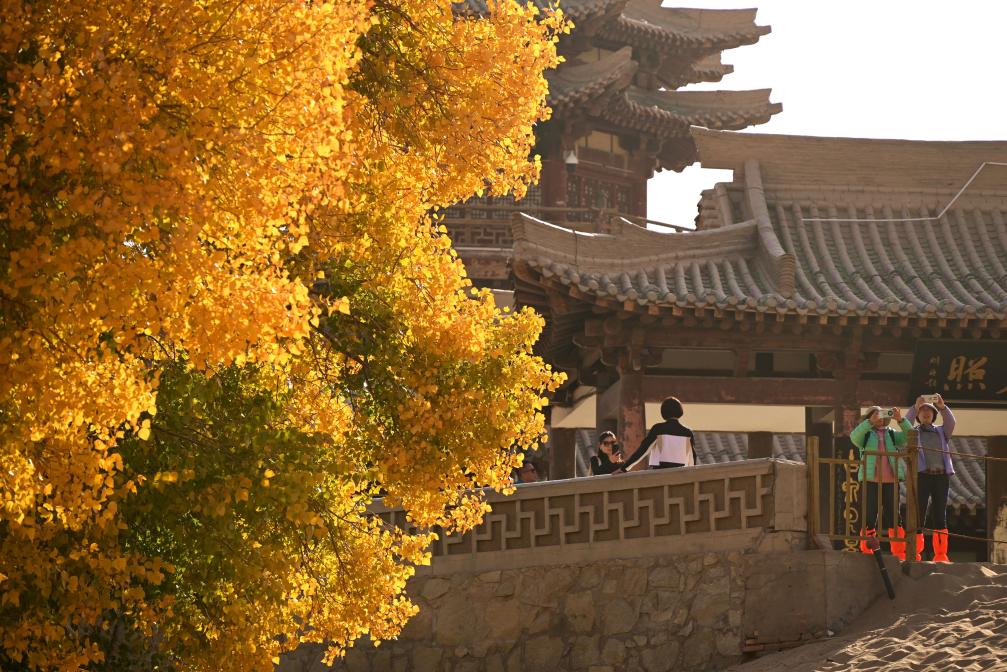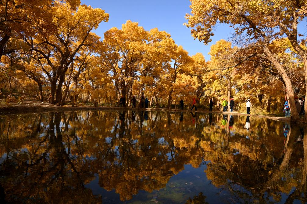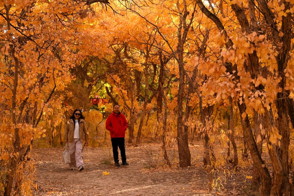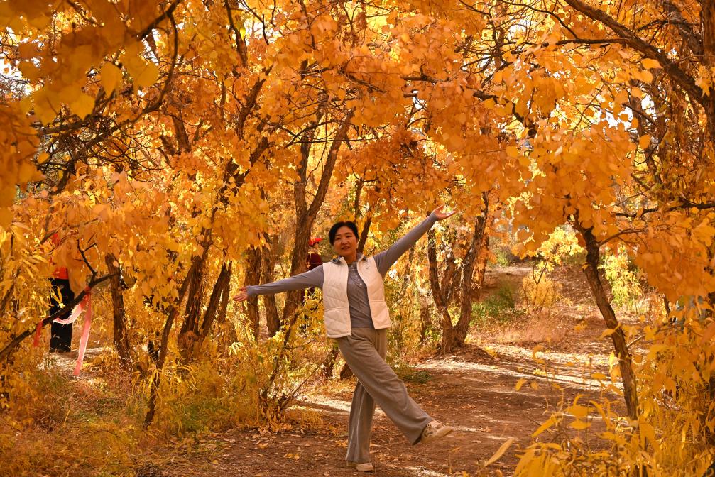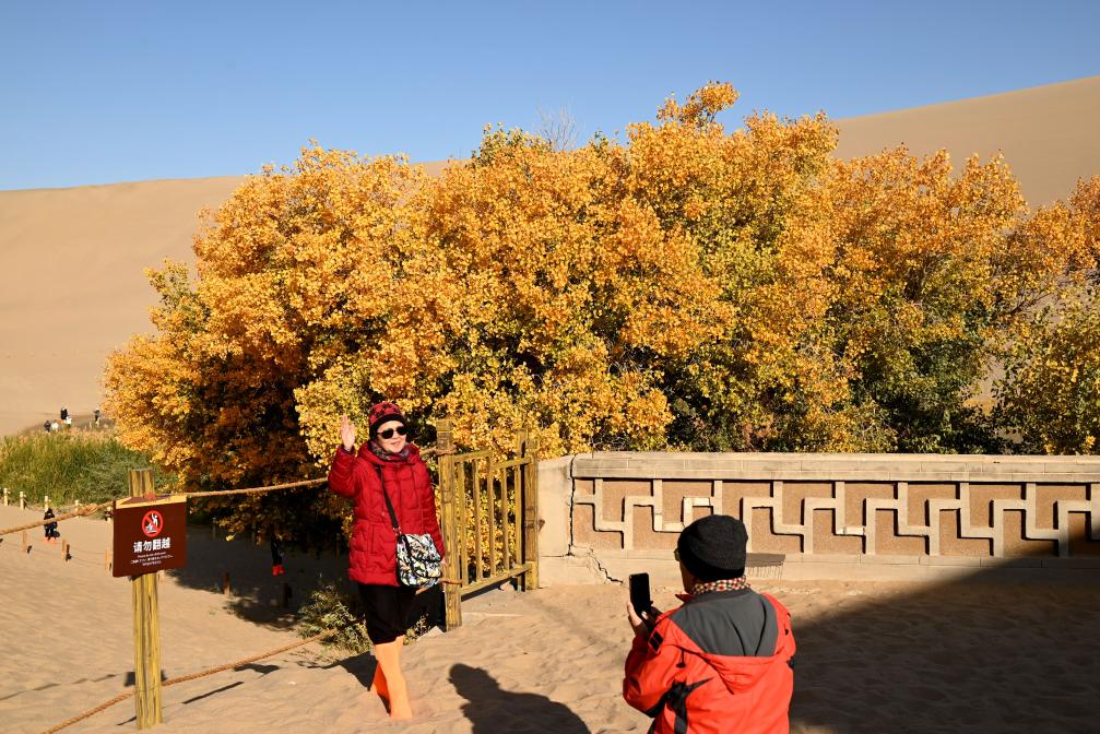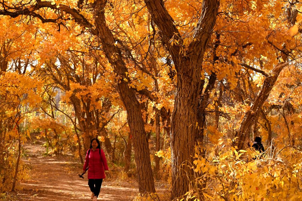 【新華社敦煌10月22日】中国甘粛省敦煌市では、コトカケヤナギ林が黄金色に染まり、秋の絶景を描き出している。見頃を迎えた林には、多くの観光客が訪れ、写真撮影を楽しんでいる。