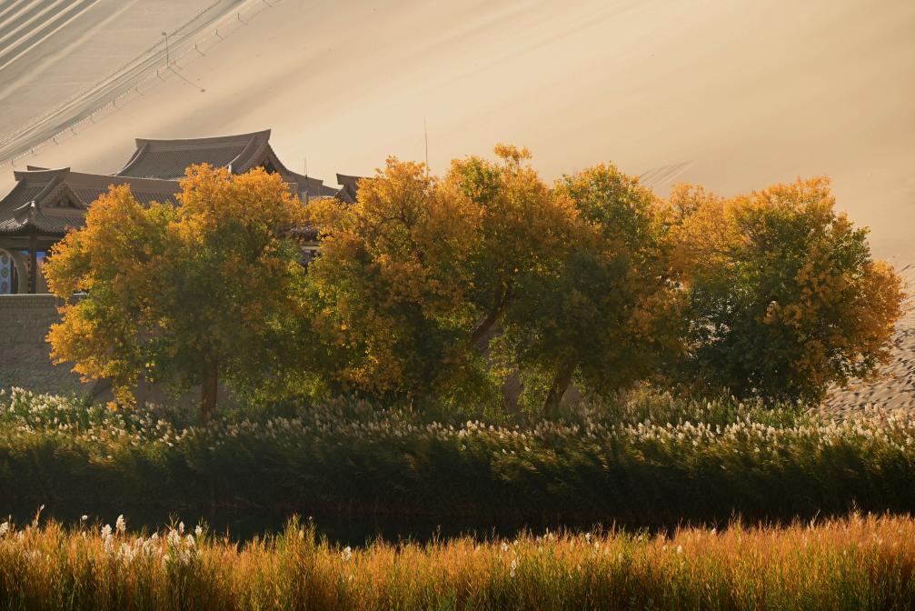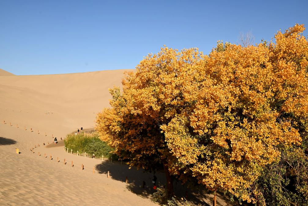 18日、敦煌市鳴沙山・月牙泉風景区で色づいたコトカケヤナギ。(敦煌=新華社配信/張暁亮)
