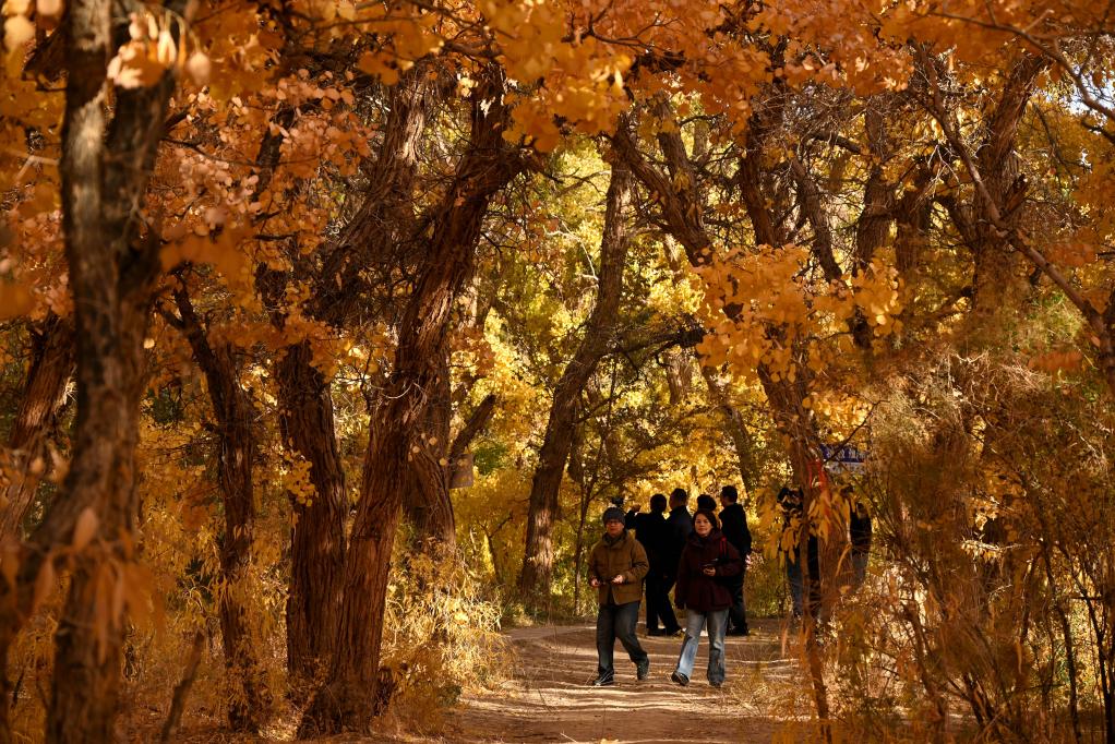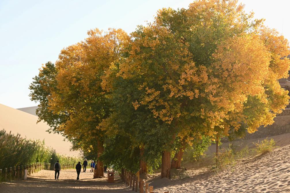 19日、敦煌市莫高鎮のコトカケヤナギ林を散策する観光客。(敦煌=新華社配信/張暁亮)