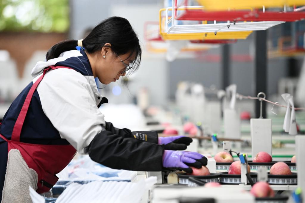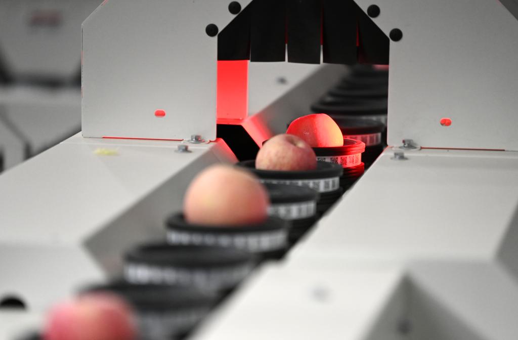 18日、リンゴの栽培や加工、輸出などを手がける地元企業の盛隆果業で稼働中の自動仕分けライン。(白水=新華社記者/李一博)